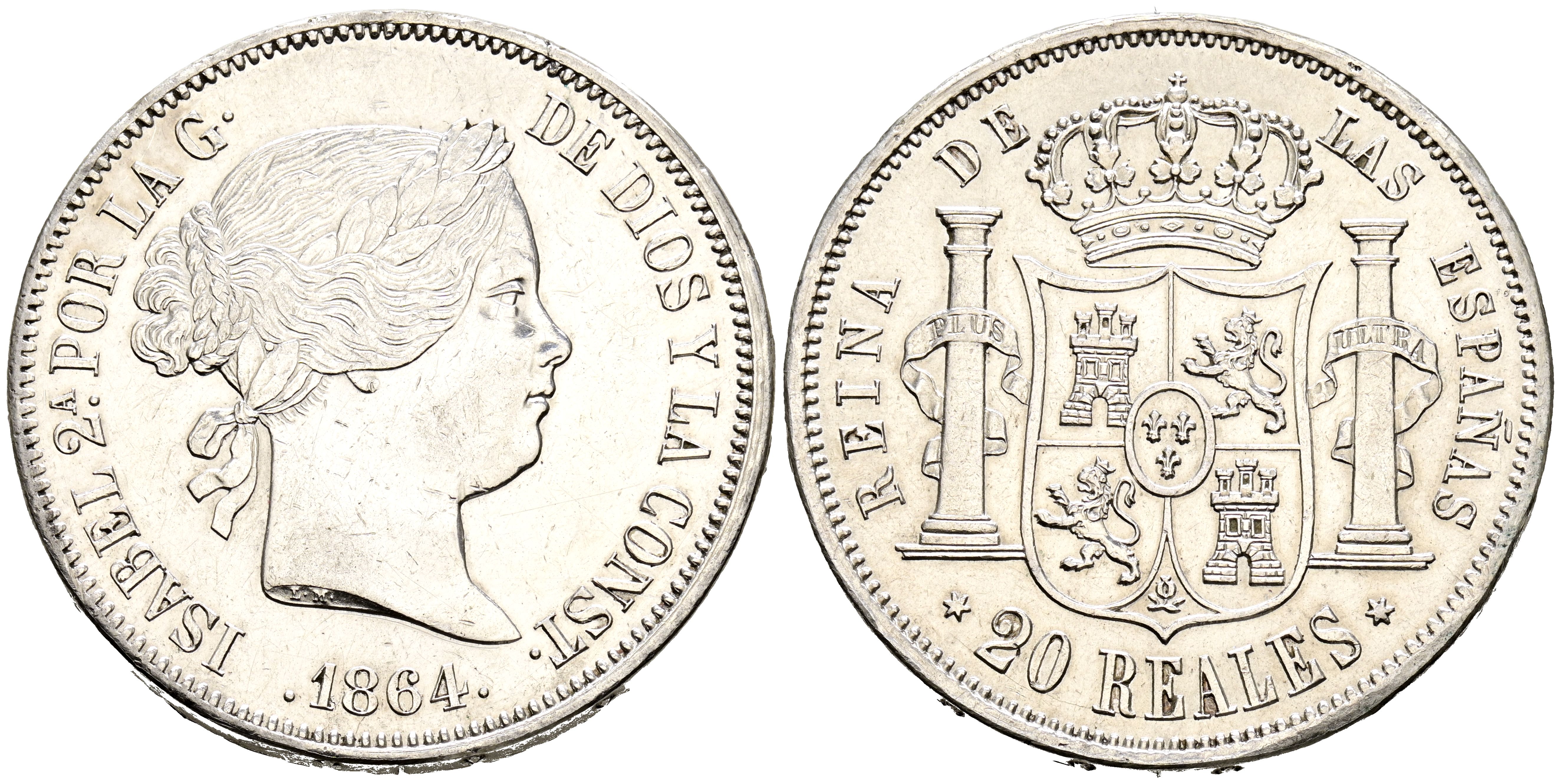 ISABEL II (1833-18368). 20 Reales. (Ar. 25,91g/37mm). 1864. Madrid. (Cal-2019-622). MBC+. Limpiada.