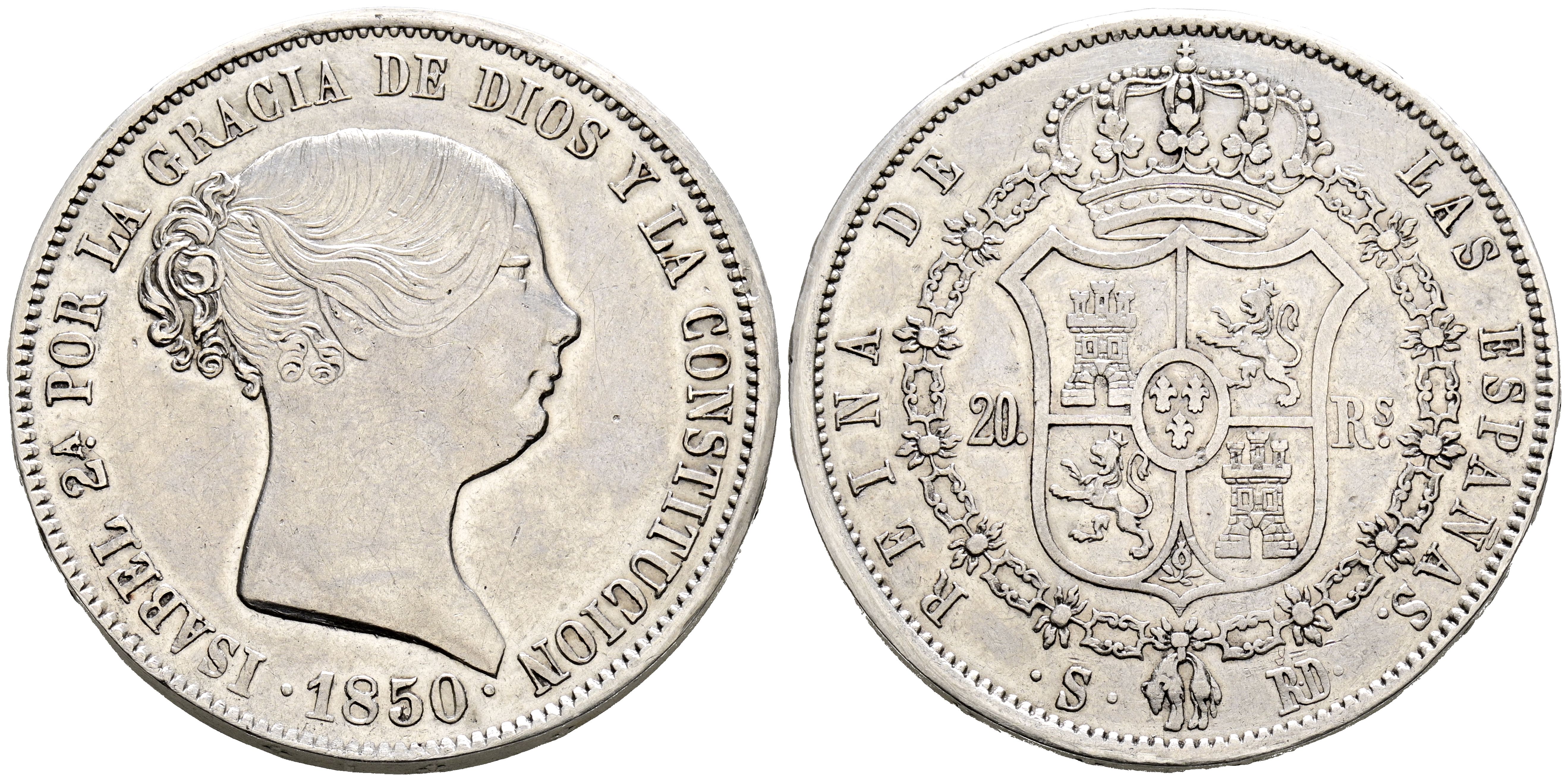 ISABEL II (1833-18368). 20 Reales. (Ar. 25,50g/37mm). 1850. Sevilla RD. (Cal-2019-624). MBC+. Muy ligero resto de brillo original. Rara.