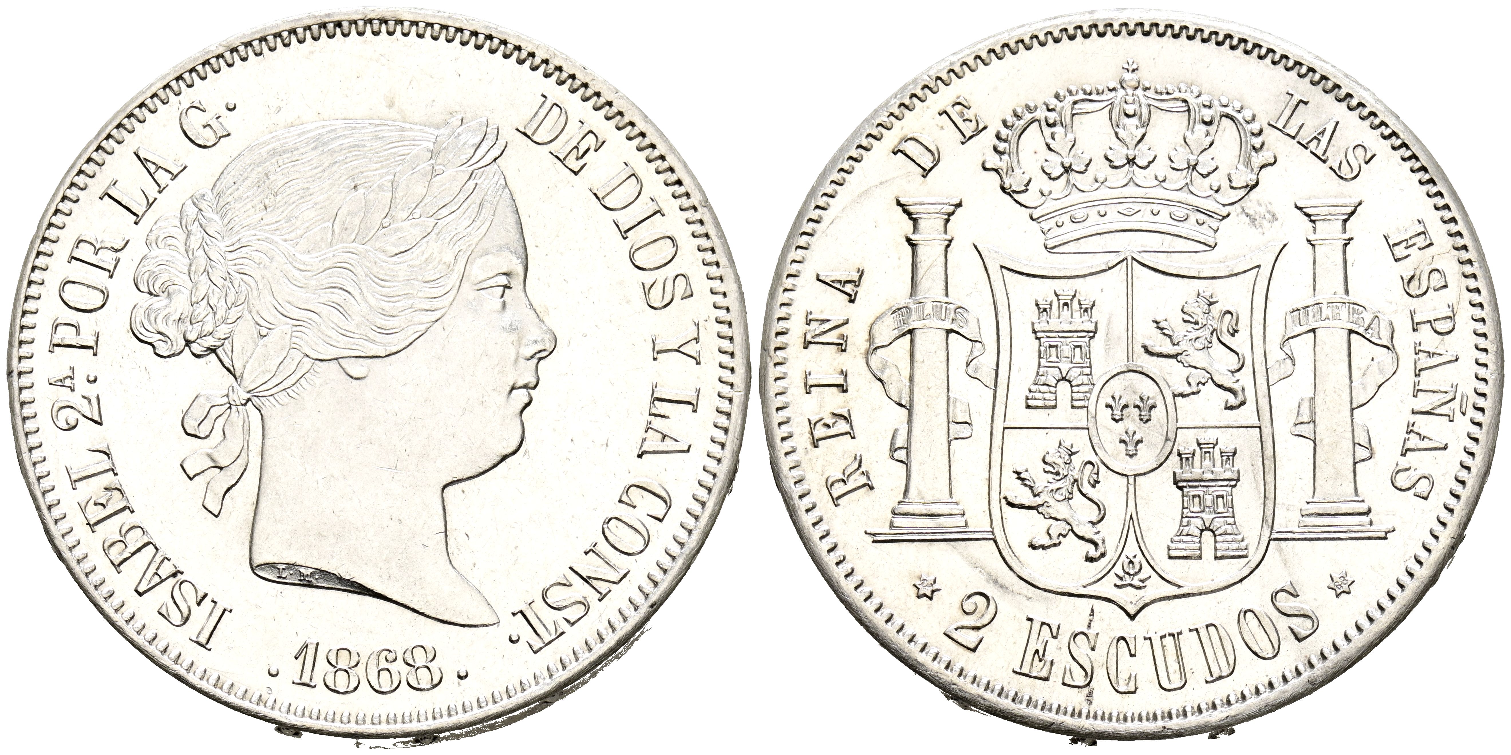 ISABEL II (1833-1868). 2 Escudos. (Ar. 25,76g/37mm). 1868 *18-68. Madrid. (Cal-2019-648). SC-. Precioso ejemplar, manteniendo restos de brillo original.