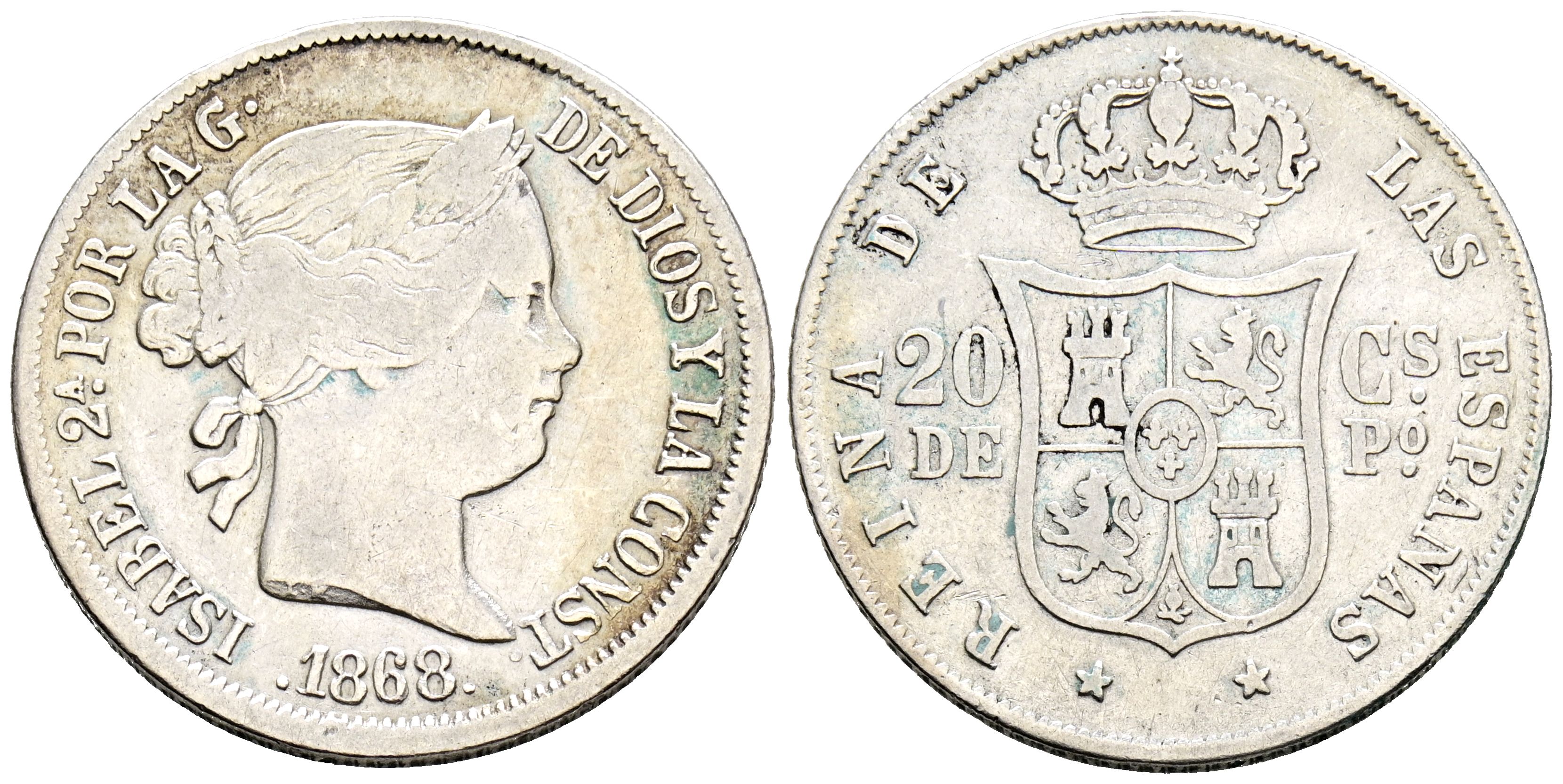 ISABEL II (1833-1868). 20 Centavos de Peso. (Ar. 5,04g/23mm). 1868. Manila. (Cal-2019-661). MBC-.