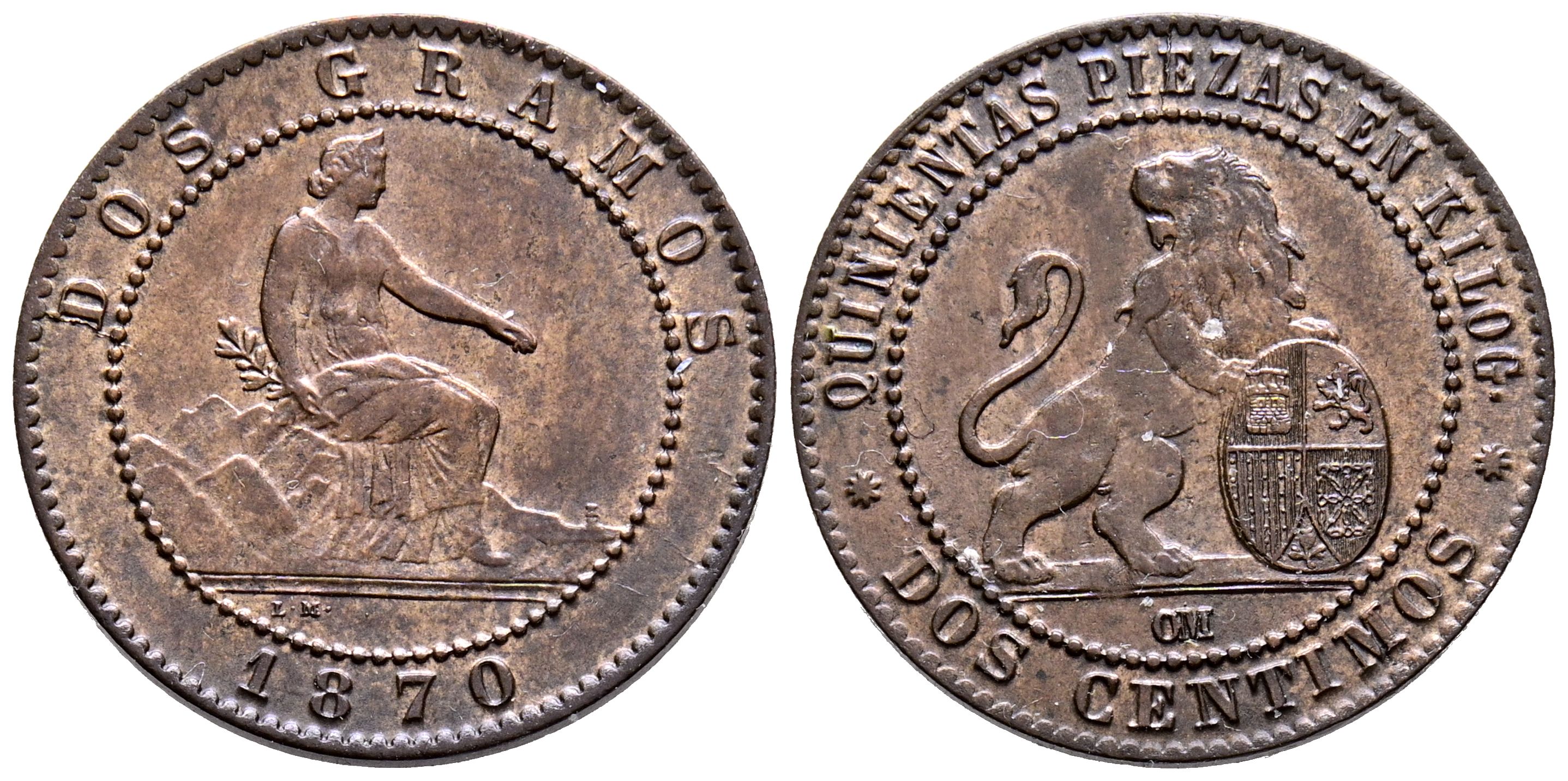 GOBIERNO PROVISIONAL (1868-1871). 2 Céntimos. (Ae. 1,98g/20mm). 1870. Barcelona. (Cal-2019-4). EBC+. Bonito ejemplar.