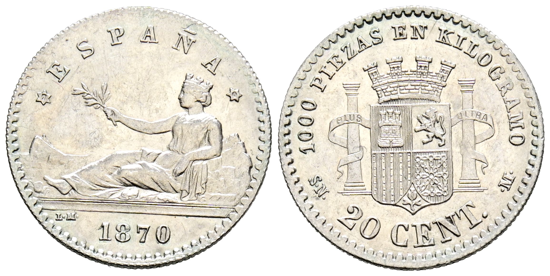 GOBIERNO PROVISIONAL (1868-1871). 20 Céntimos (Ar. 1,00g/16mm). 1870 *7-0. Madrid SNM. (Cal-2019-12). EBC+. Leves rayitas. Muy escaso ejemplar y más en esta preciosa calidad manteniendo restos de brillo original.