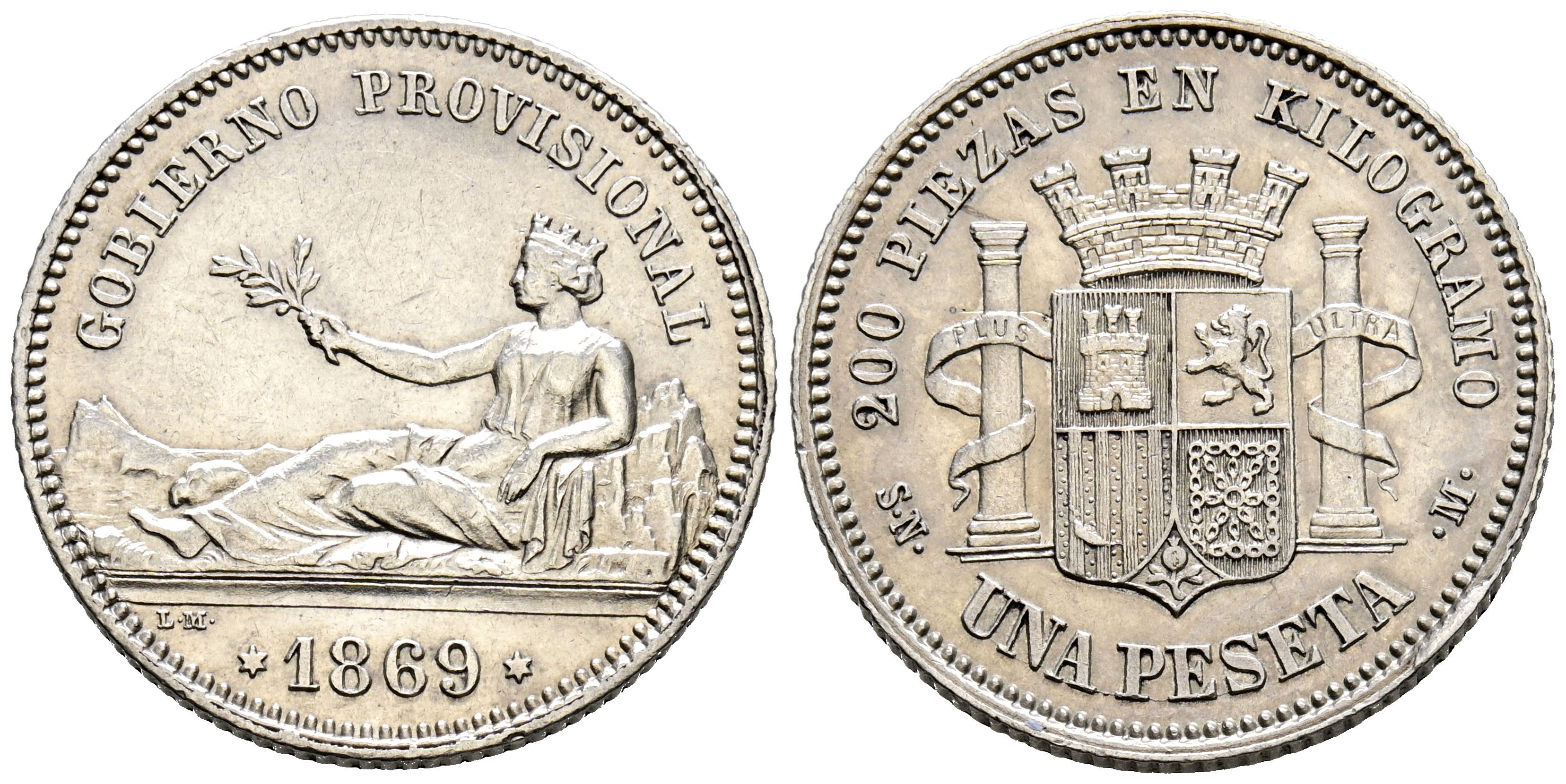 GOBIERNO PROVISIONAL (1868-1871). 1 Peseta. (Ar. 4,95g/23mm). 1869. Madrid SNM. (Cal-2019-16). Leyenda: Gobierno Provisional. EBC-. Bonito ejemplar.