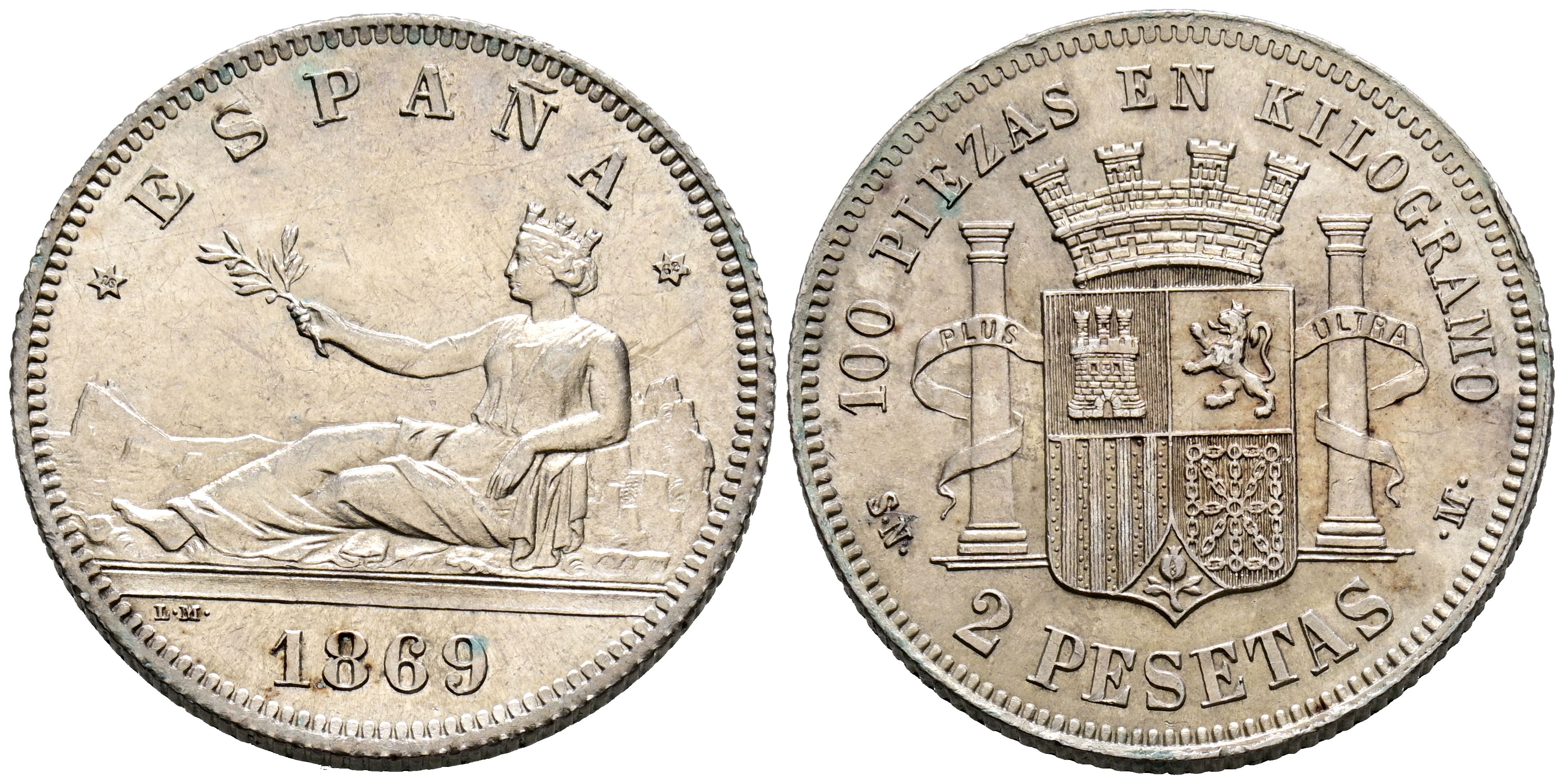 GOBIERNO PROVISIONAL (1868-1871). 2 Pesetas. (Ar. 9,97g/27mm). 1869 *18-69. Madrid SNM. (Cal-2019-22). EBC+. Restos de brillo original. Excelente ejemplar, escaso así.