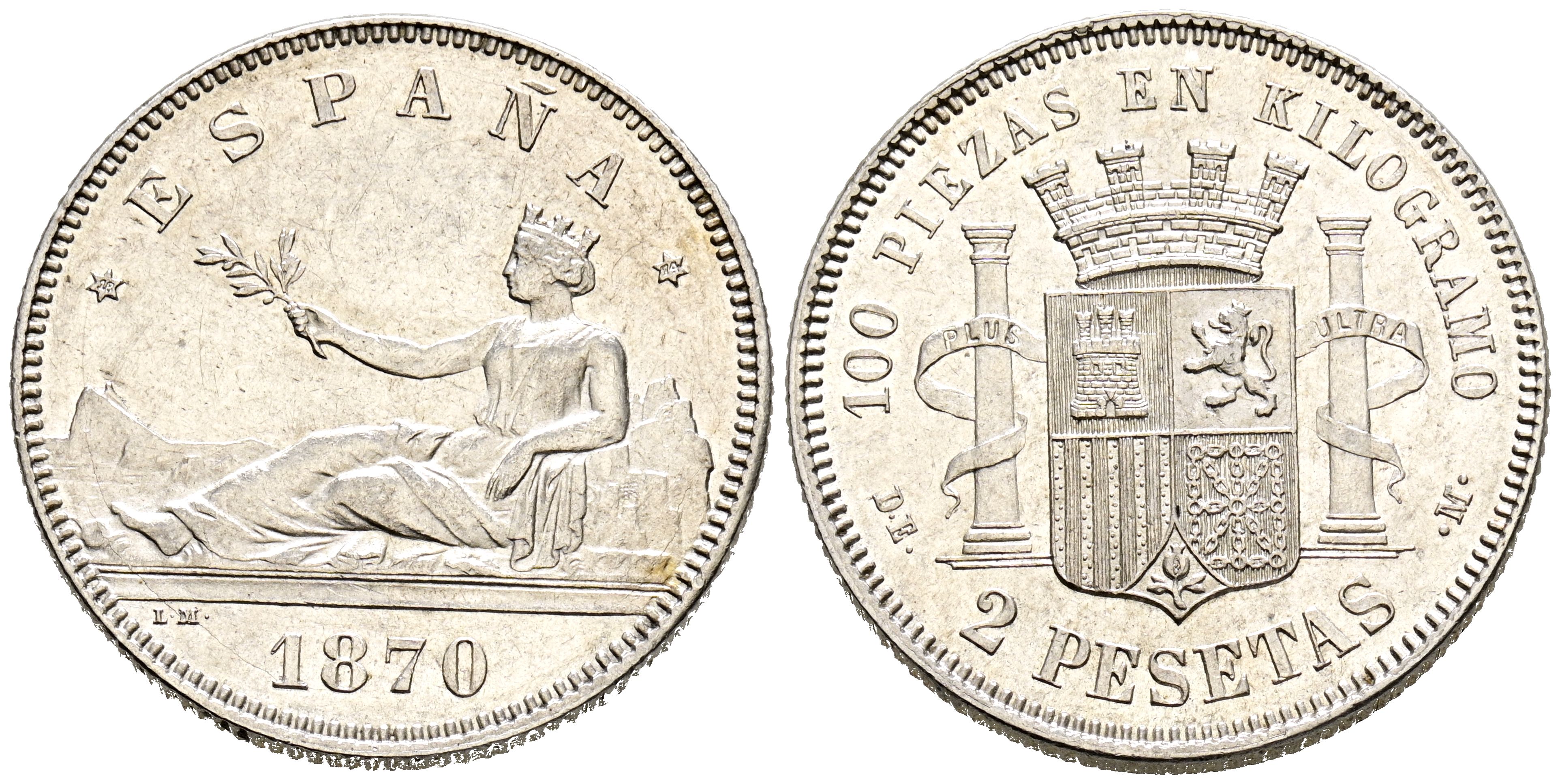 GOBIERNO PROVISIONAL (1868-1871). 2 Pesetas. (Ar. 9,97g/28mm). 1870 *18-74. Madrid SNM. (Cal-2019-31). EBC+. Restos de brillo original. Excelente ejemplar, escaso así.