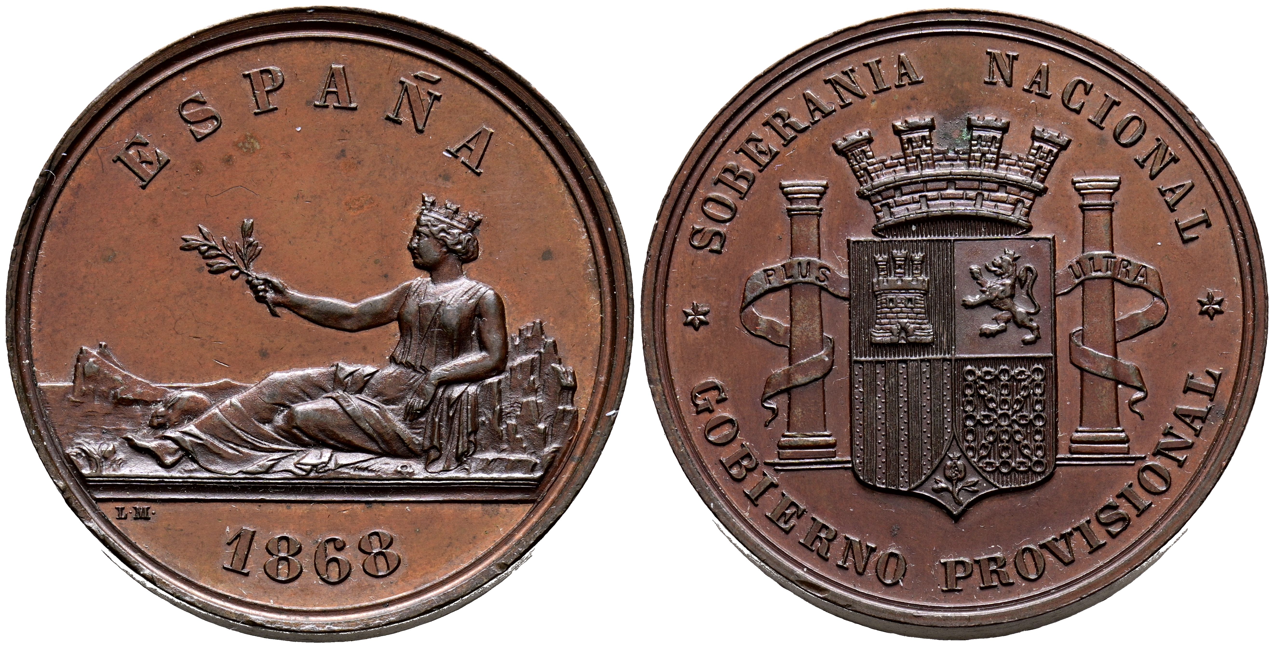 GOBIERNO PROVISIONAL (1868-1871). Soberanía Nacional. (Ae. 24,52g/37mm). 1868. Madrid. Grabador: Luis Marchioni. (Cal-2019-35). Sirvió de prueba para realizar las 5 Pesetas de 1869. SC-. Precioso ejemplar con un tono muy bonito, escasa así.