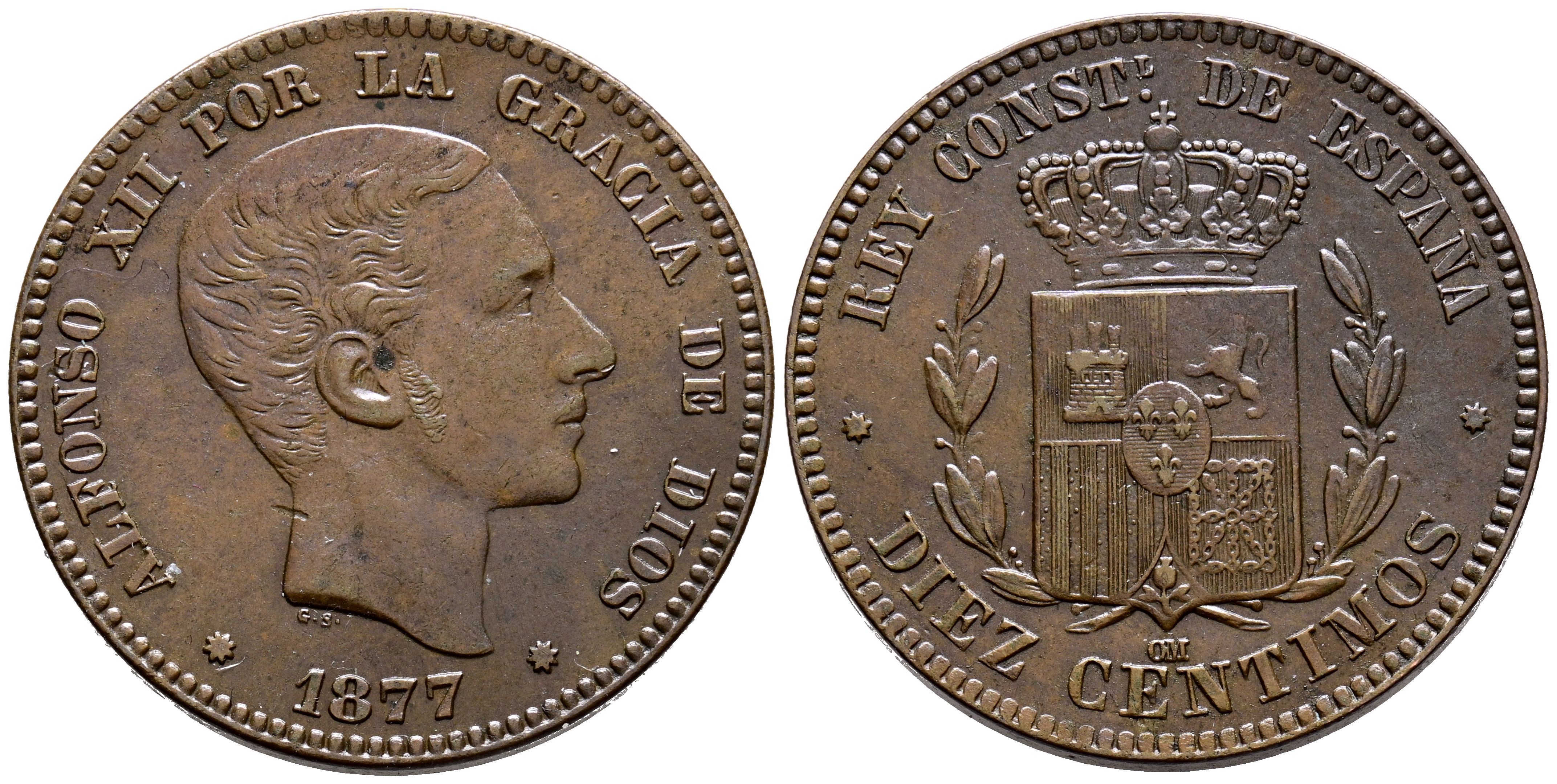 ALFONSO XII (1874-1885). 10 Céntimos. (Ae. 10,03g/30mm). 1877. Barcelona OM. (Cal-2019-8). Variante oreja rayada. MBC+/MBC.