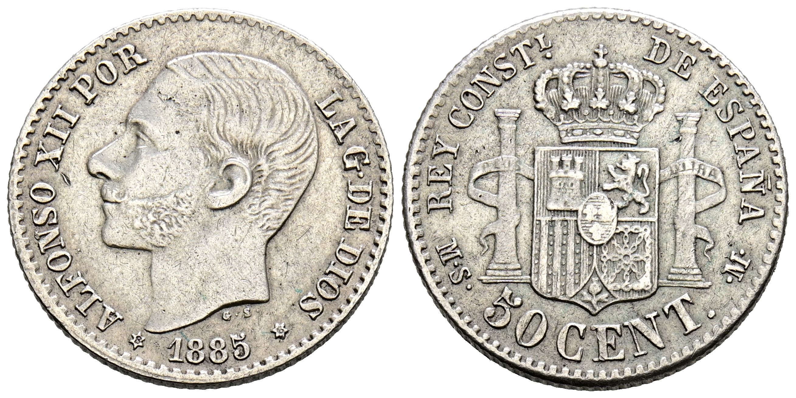 ALFONSO XII (1874-1885). 50 Céntimos. (Ar. 2,49g/18mm). 1885 *8-6. Madrid MSM. (Cal-2019-12). MBC+. Acuñada bajo el reinado de Alfonso XIII.