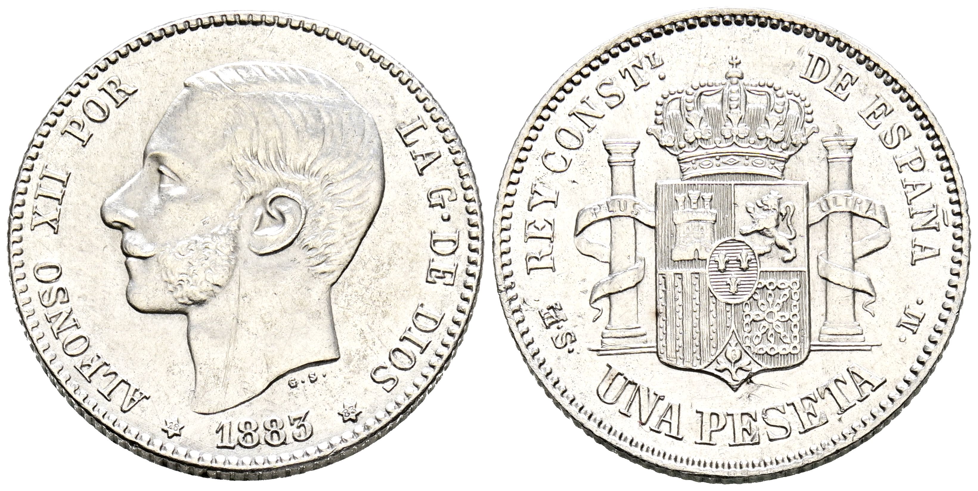 ALFONSO XII (1874-1885). 1 Peseta. (Ar. 4,97/23mm). 1883 *18-83. Madrid MSM. (Cal-2019-21). EBC+. Leves rayitas.