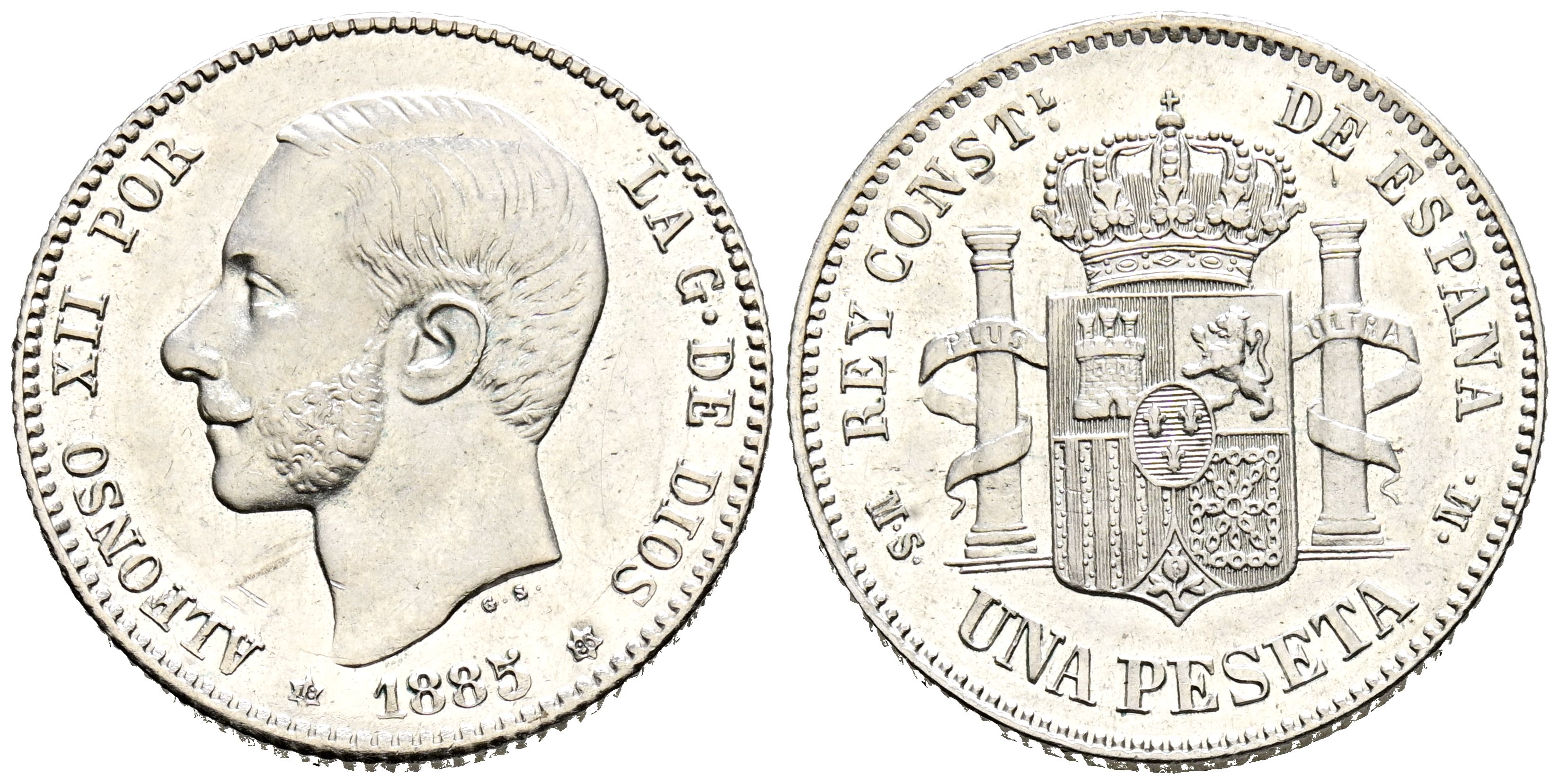 ALFONSO XII (1874-1885). 1 Peseta. (Ar. 5,13/23mm). 1885 *18-86. Madrid MSM. (Cal-2019-25). EBC+. Leves rayitas. Escasa y más así. Acuñada ya en el reinado de Alfonso XIII.
