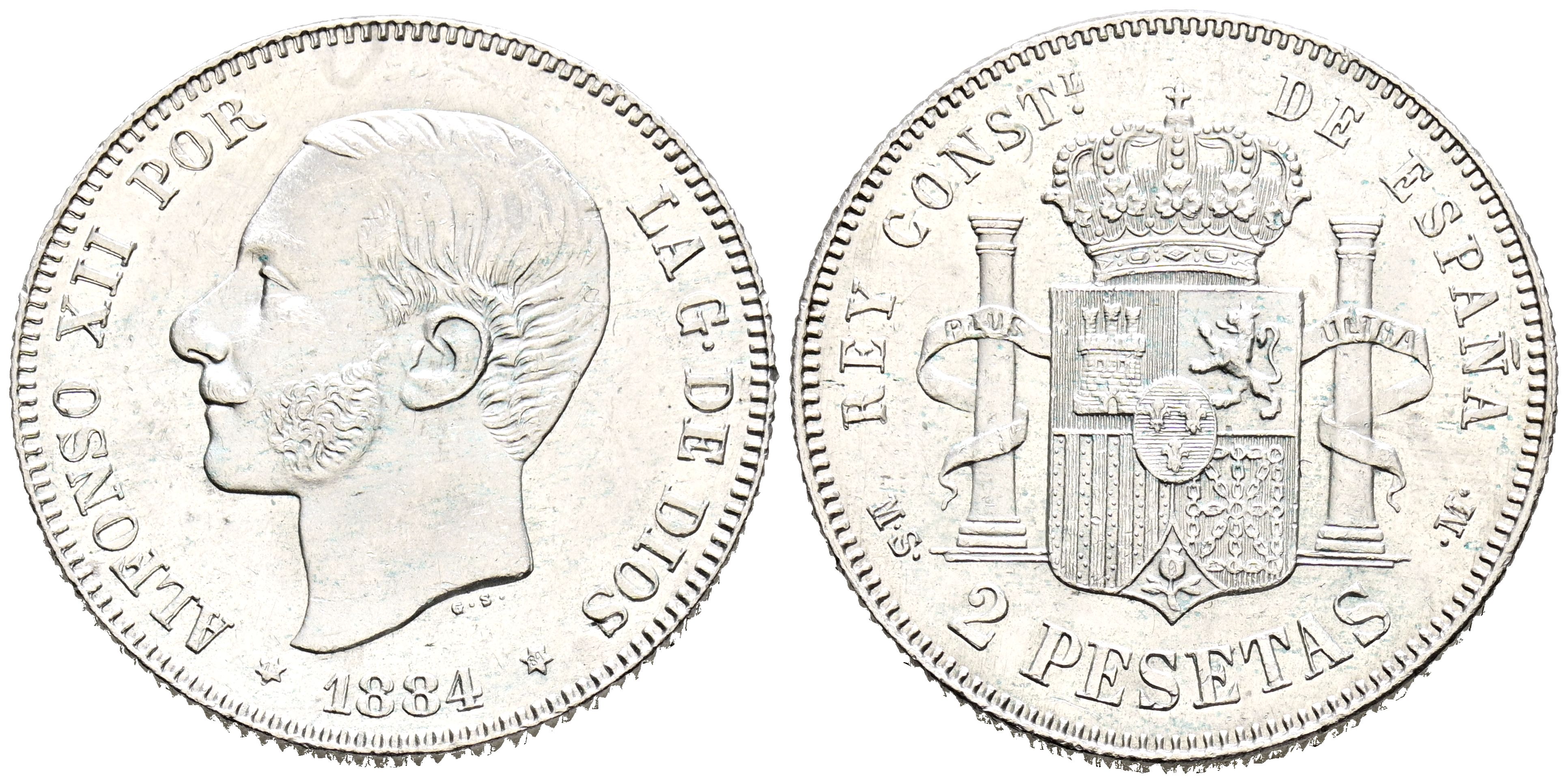 ALFONSO XII (1874-1885). 2 Pesetas. (Ar. 9,98g/27mm). 1884 *18-84. Madrid MSM. (Cal-2019-34). SC-/EBC+. Ligeras marquitas. Escasa y más en esta calidad.