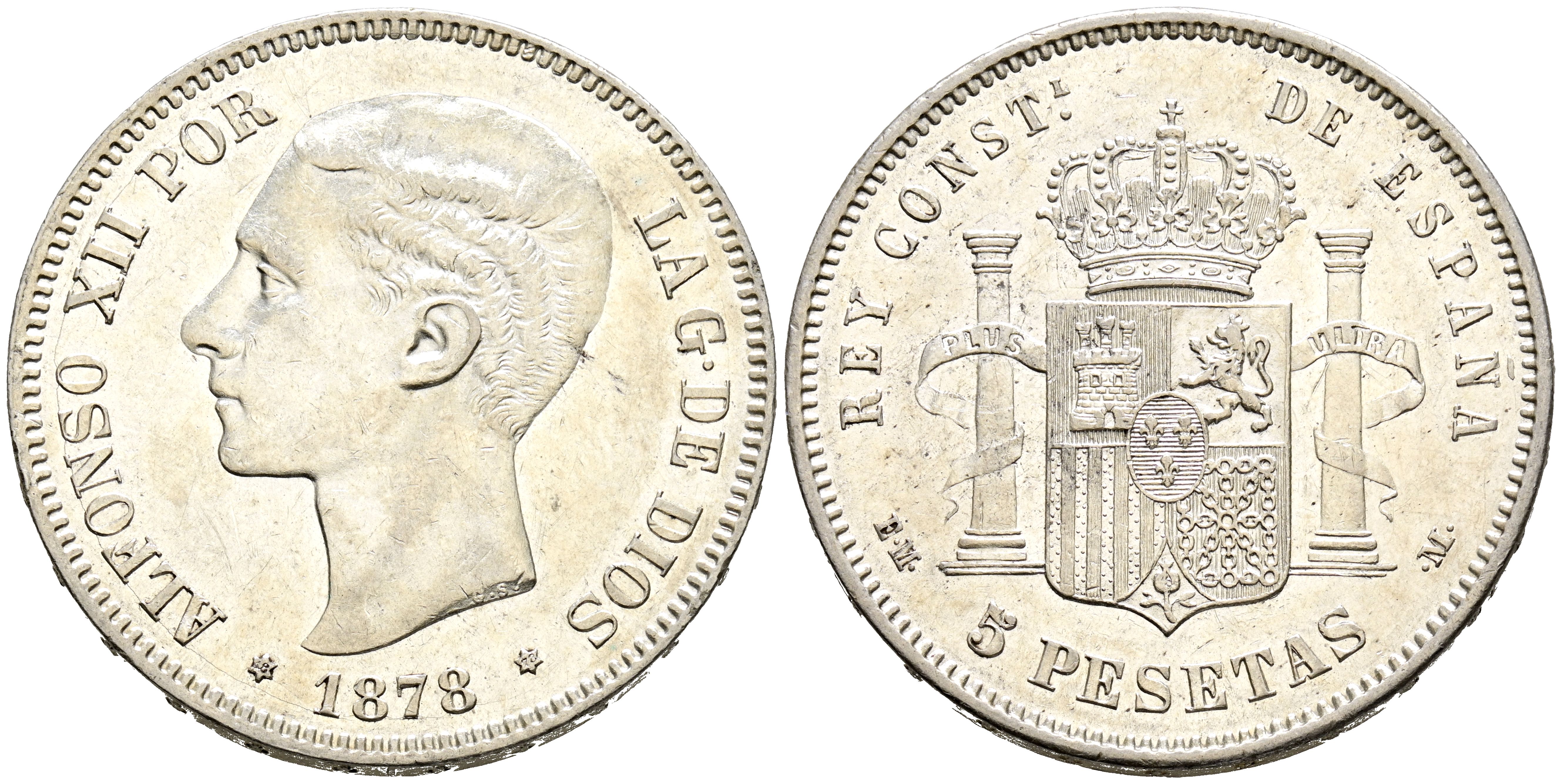 ALFONSO XII (1874-1885). 5 Pesetas. (Ar. 25,05g/37mm). 1878 *18-78. Madrid EMM. (Cal-2019-41). EBC-. Ligeros restos de brillo original.