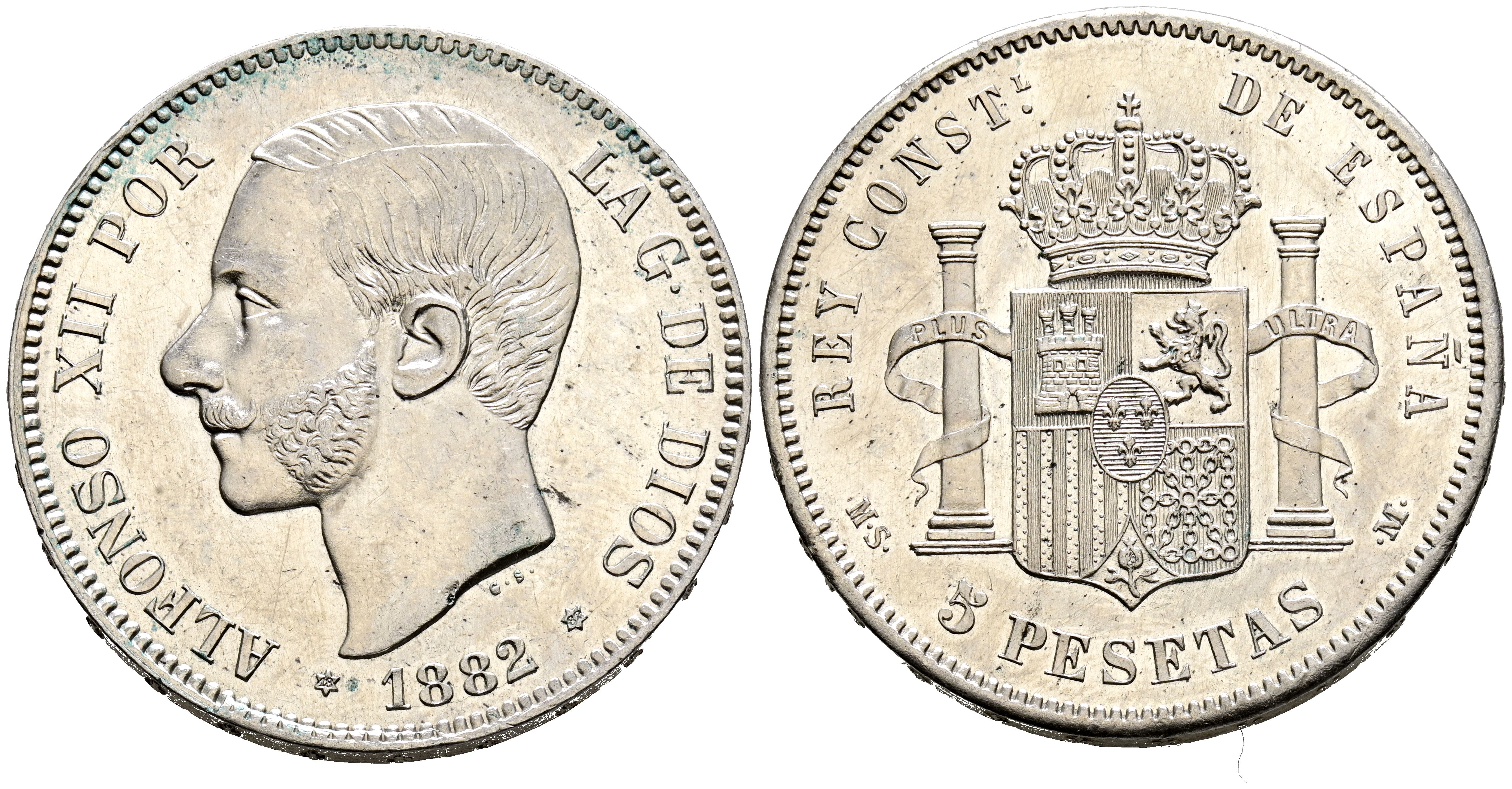 ALFONSO XII (1874-1885). 5 Pesetas. (Ar. 24,63g/37mm). 1882 *18-82. Madrid MSM. (Cal-2019-51). EBC. Rayitas y marquitas. Bonito ejemplar con restos de brillo original.