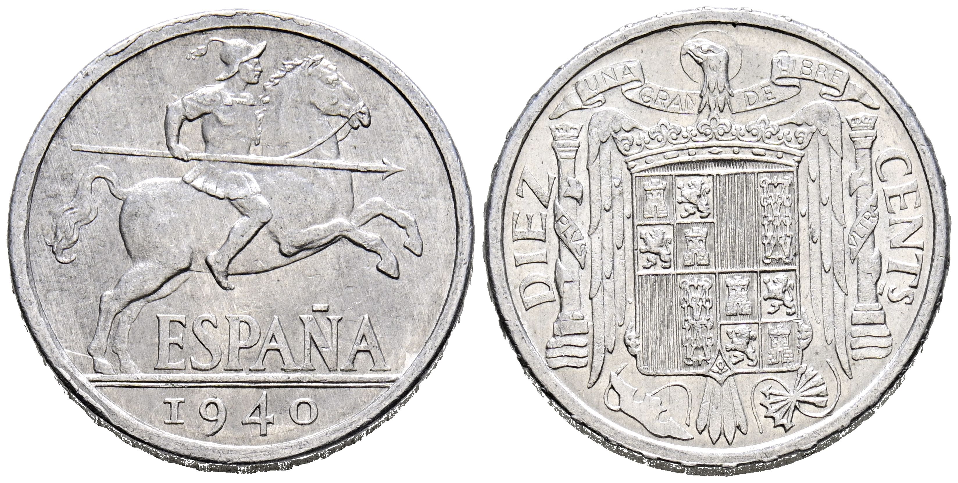 ESTADO ESPAÑOL (1936-1975). 10 Céntimos. (Al. 1,87g/23mm). 1940. Madrid. (Cal-2019-6). Leyenda: PLVS. EBC+. Escasa.
