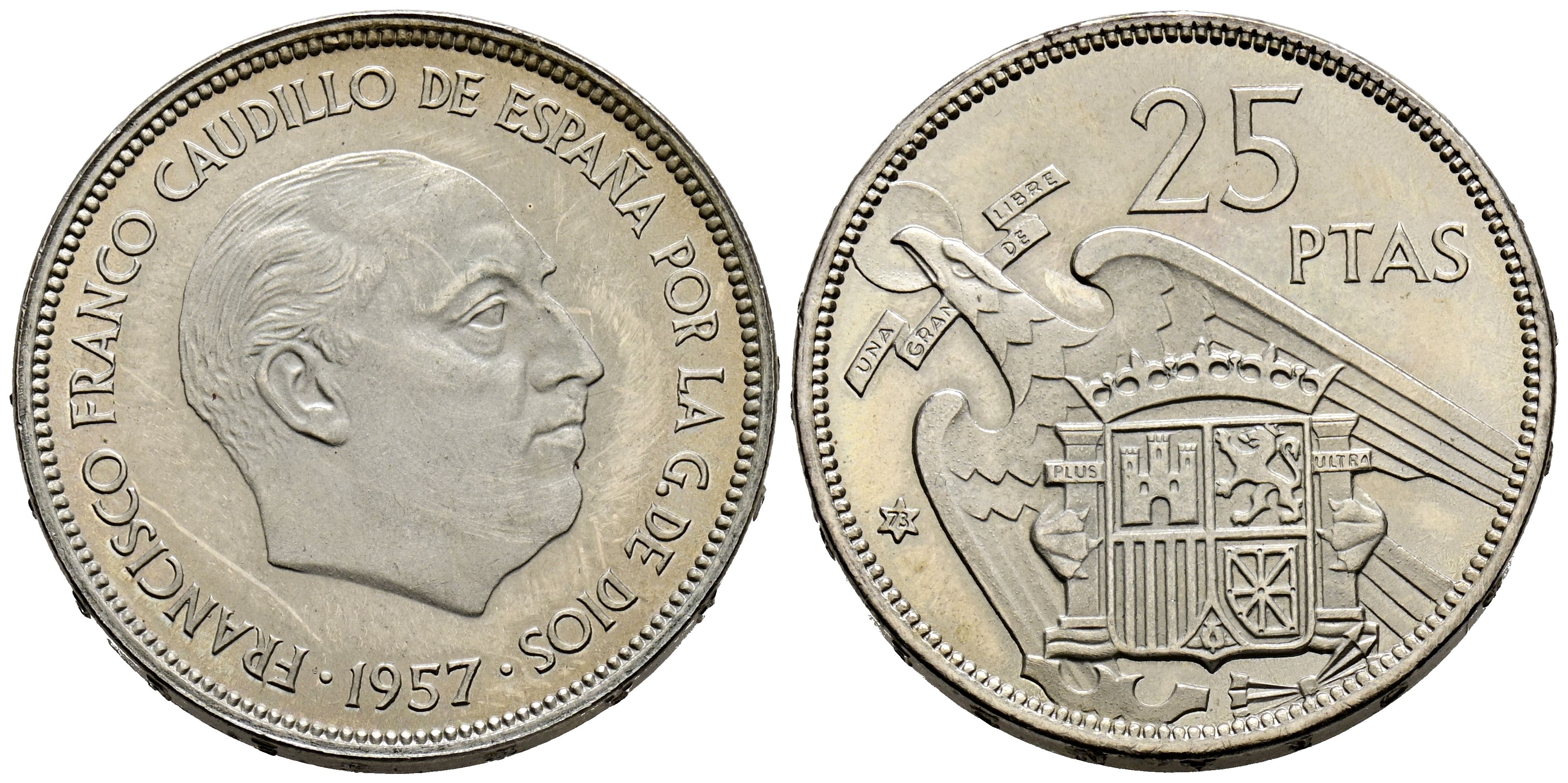ESTADO ESPAÑOL (1936-1975). 25 Pesetas. (Ni. 8,34g/27mm). 1957 *73. Madrid. (Cal-2019-128). SC. Extraída de cartucho. Precioso brillo.