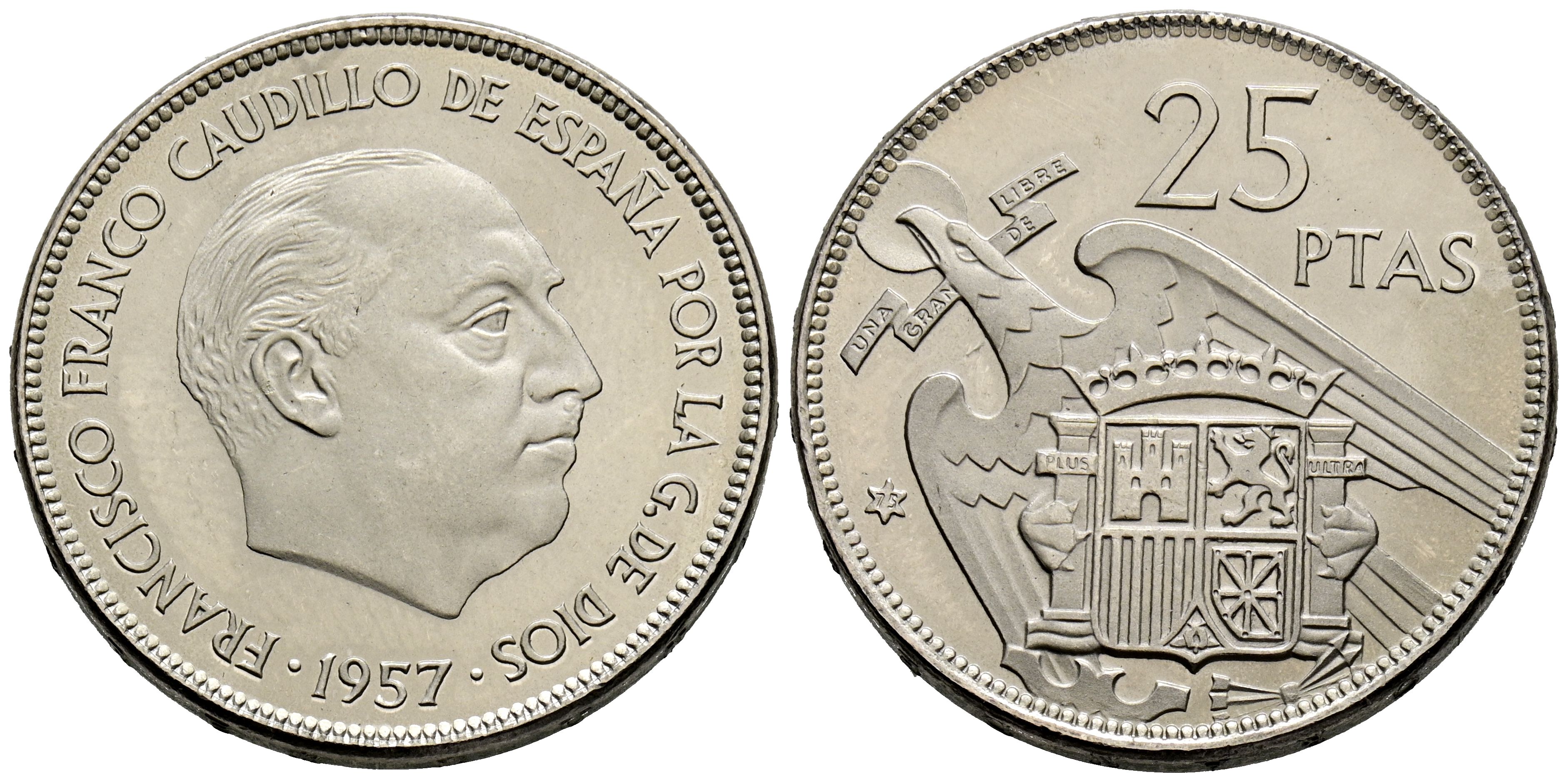 ESTADO ESPAÑOL (1936-1975). 25 Pesetas. (Ni. 8,51g/27mm). 1957 *75. Madrid. (Cal-2019-130). SC. Extraída de cartucho. Precioso brillo.