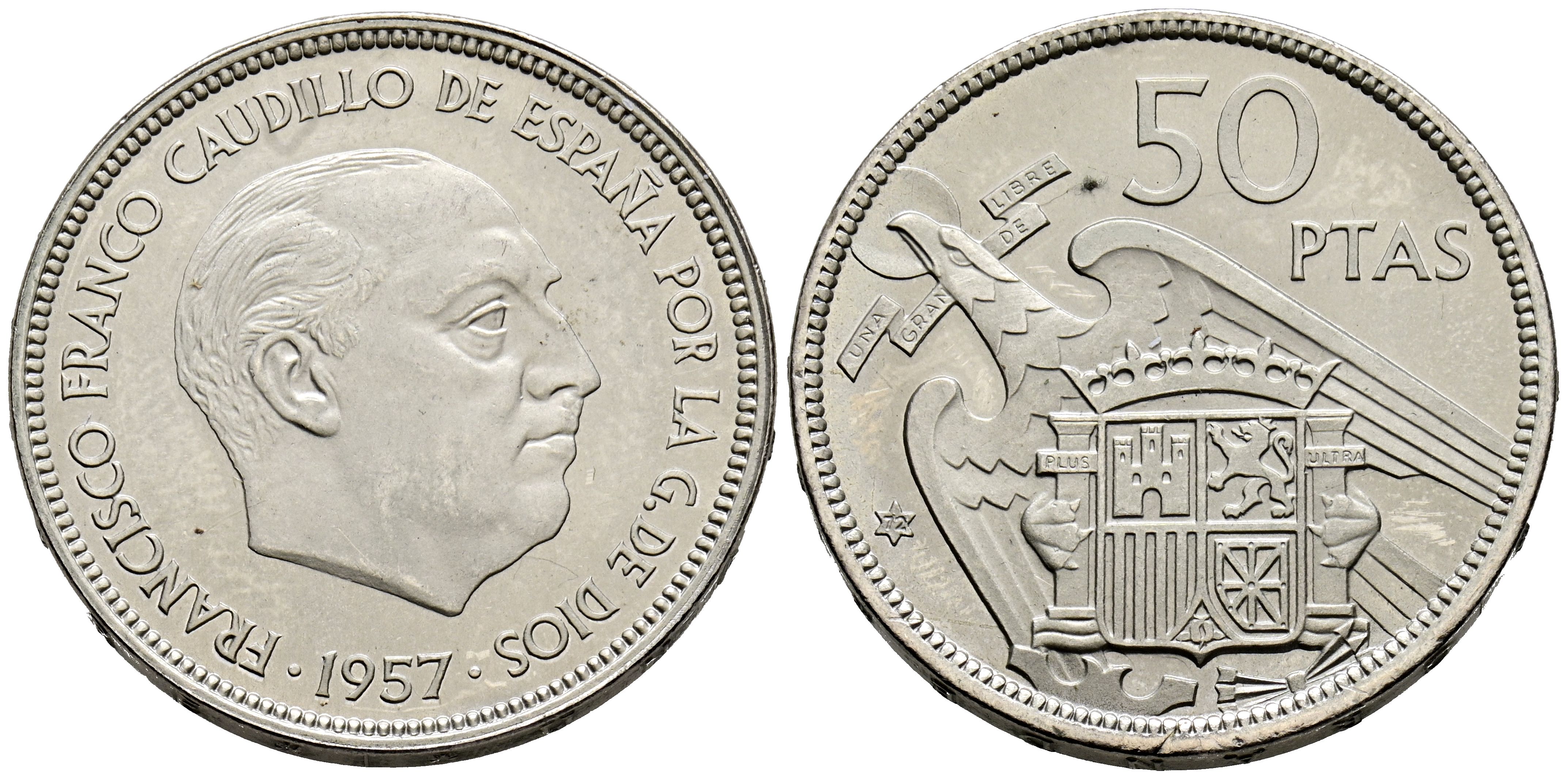 ESTADO ESPAÑOL (1936-1975). 50 Pesetas. (Ni. 12,36g/30mm). 1957 *72. Madrid. (Cal-2019-141). SC. Extraída de cartucho. Precioso brillo.