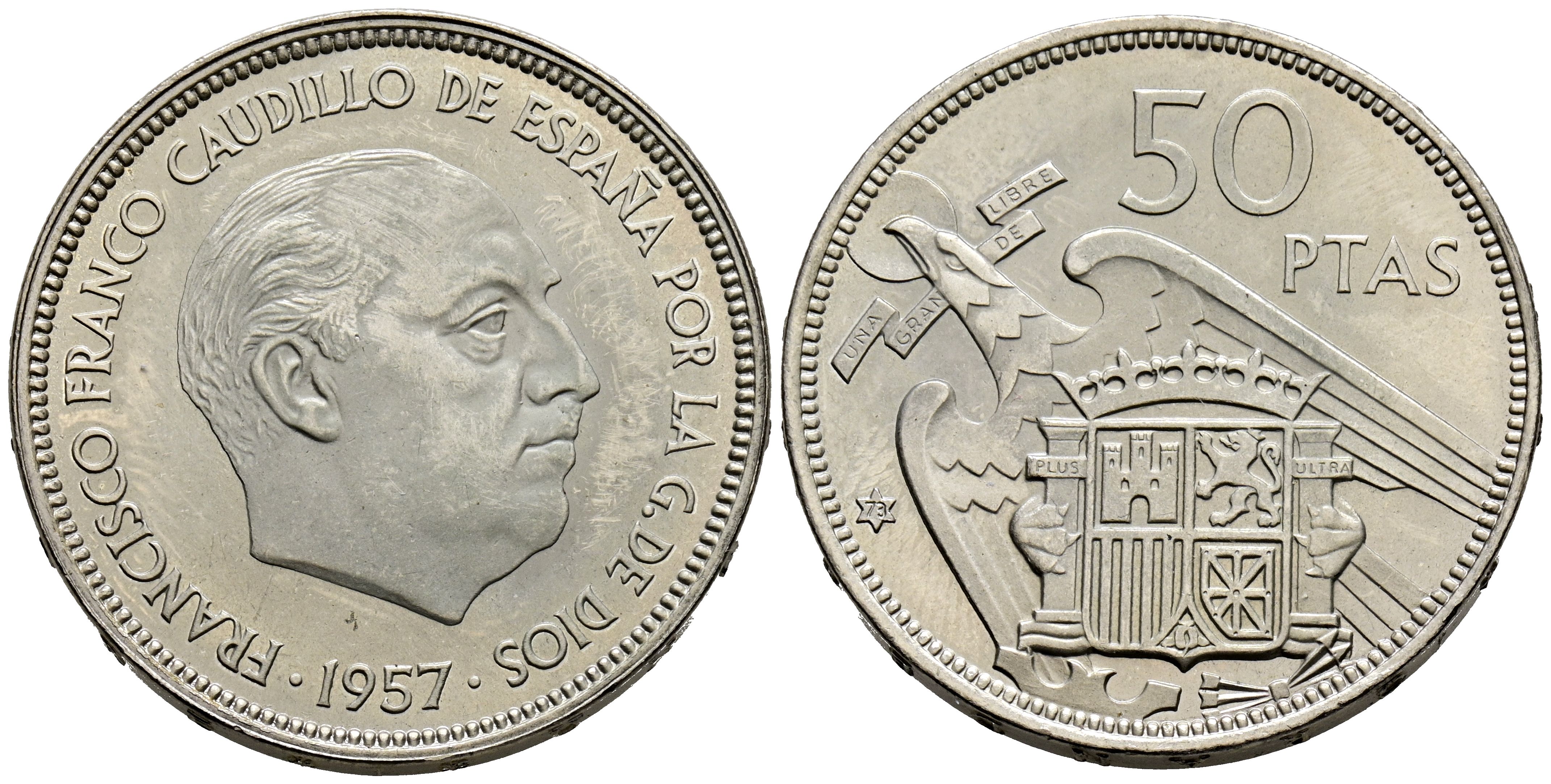ESTADO ESPAÑOL (1936-1975). 50 Pesetas. (Ni. 12,41g/30mm). 1957 *73. Madrid. (Cal-2019-142). SC. Extraída de cartucho. Precioso brillo.