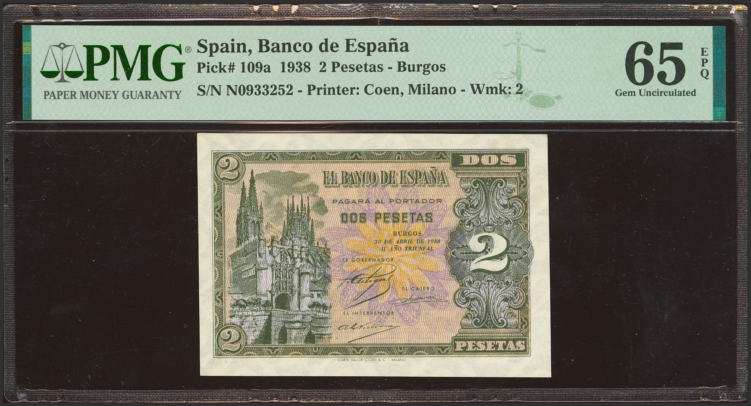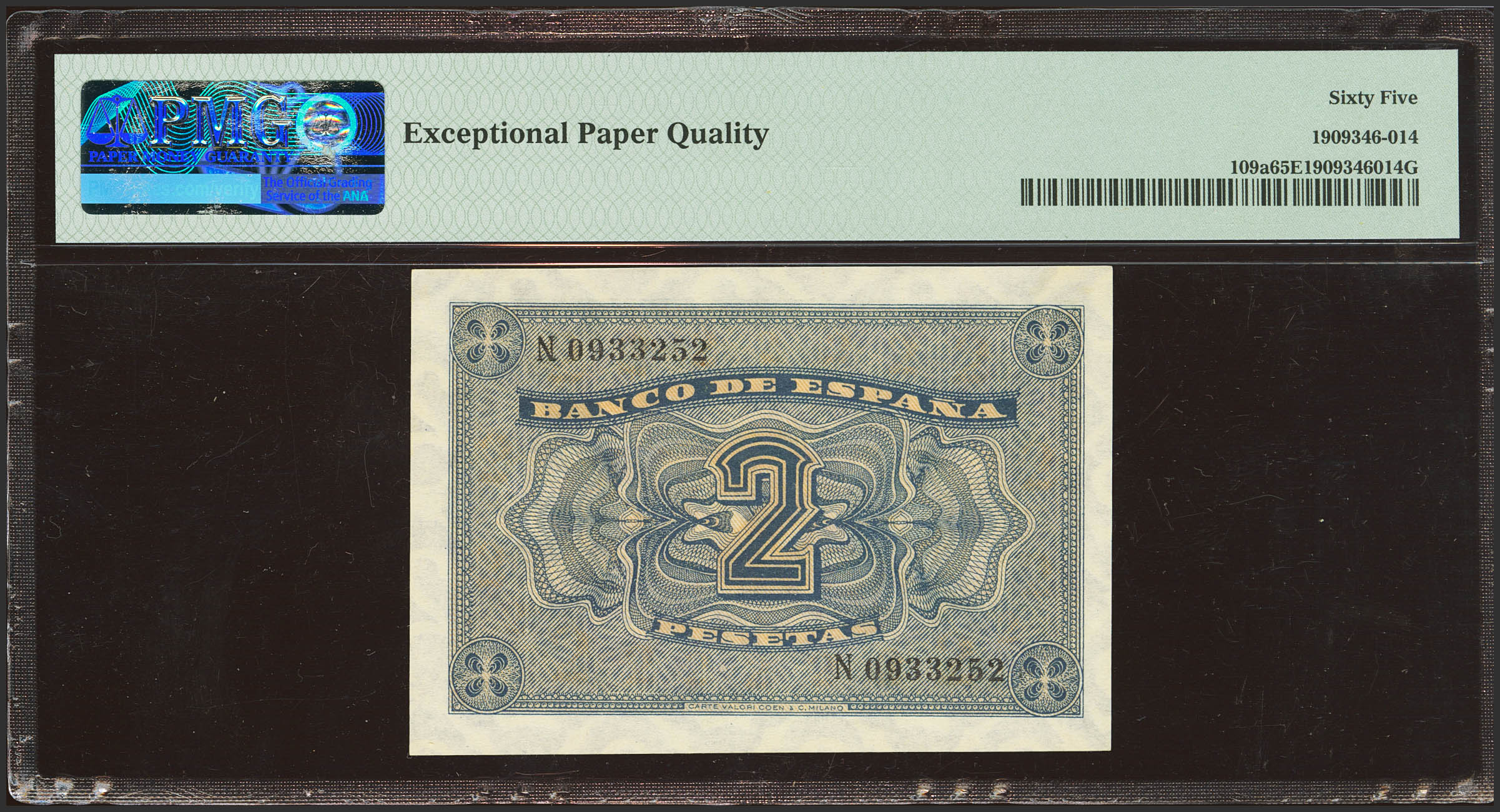 1 Pesetas. 30 de Abril de 1938. Serie N. (Edifil 2023: 428a, Pick: 108a). Inusual en esta calidad, apresto original. SC. Encapsulado PMG65EPQ.