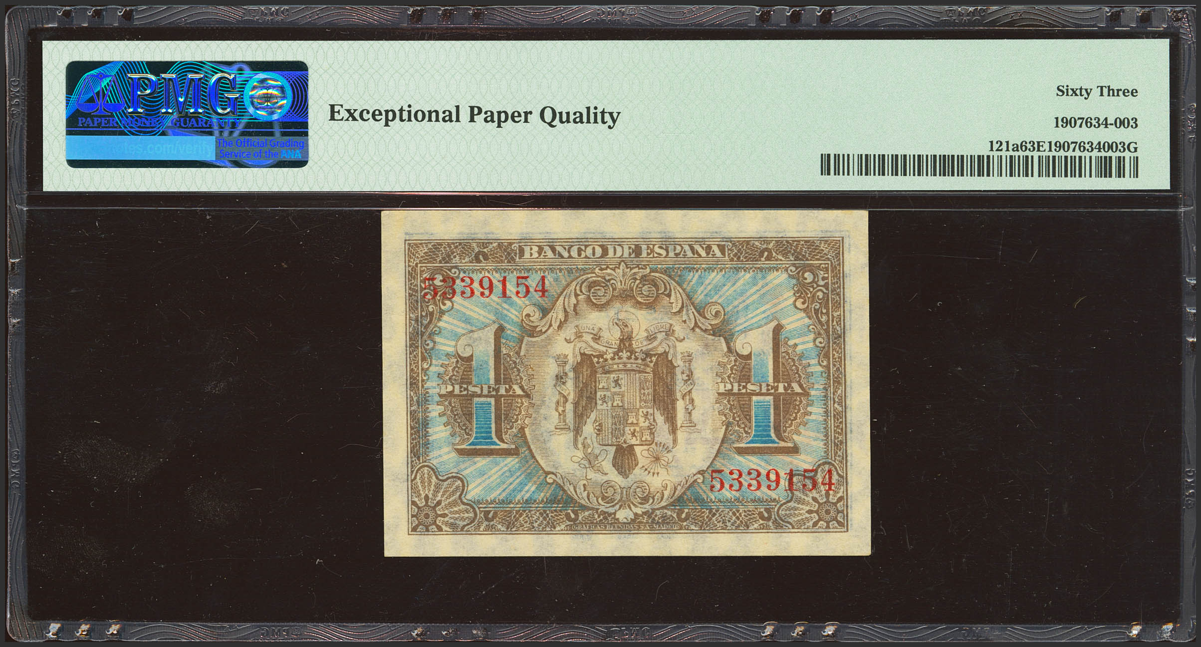 1 Pesetas. 1 de Junio de 1940. Sin serie. (Edifil 2023: 441, Pick: 121a). Inusual en esta calidad, apresto original. SC. Encapsulado PMG63EPQ.