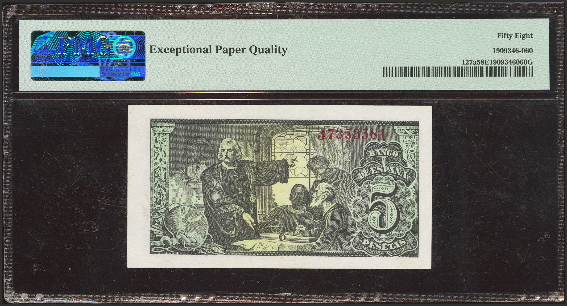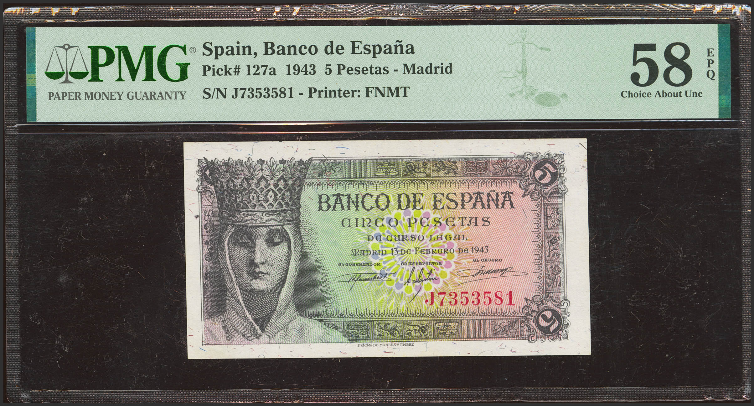 5 Pesetas. 13 de Febrero de 1943. Serie J, última serie emitida. (Edifil 2023: 446b, Pick: 127a). Apresto original. EBC+++. Encapsulado PMG58EPQ.