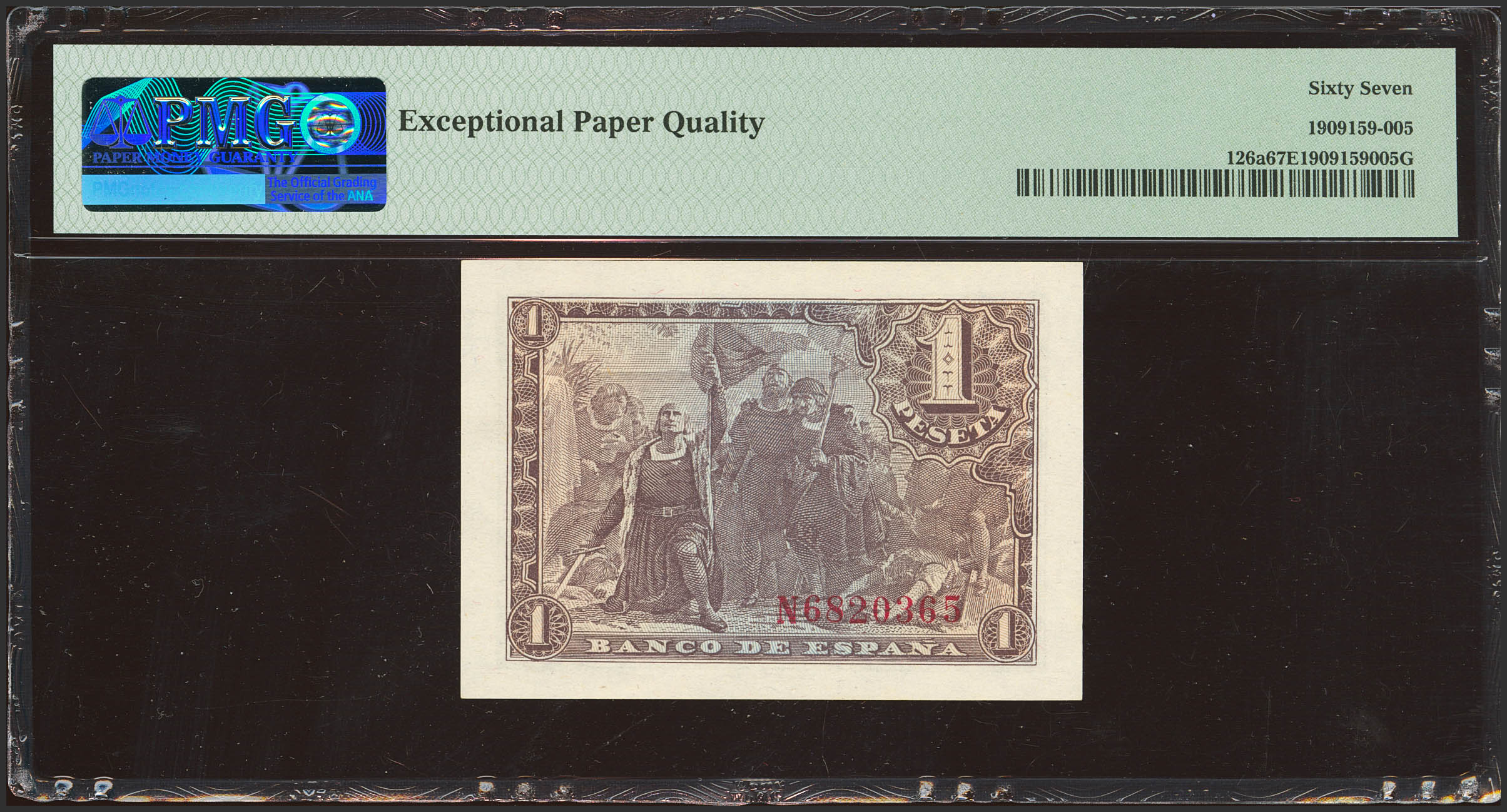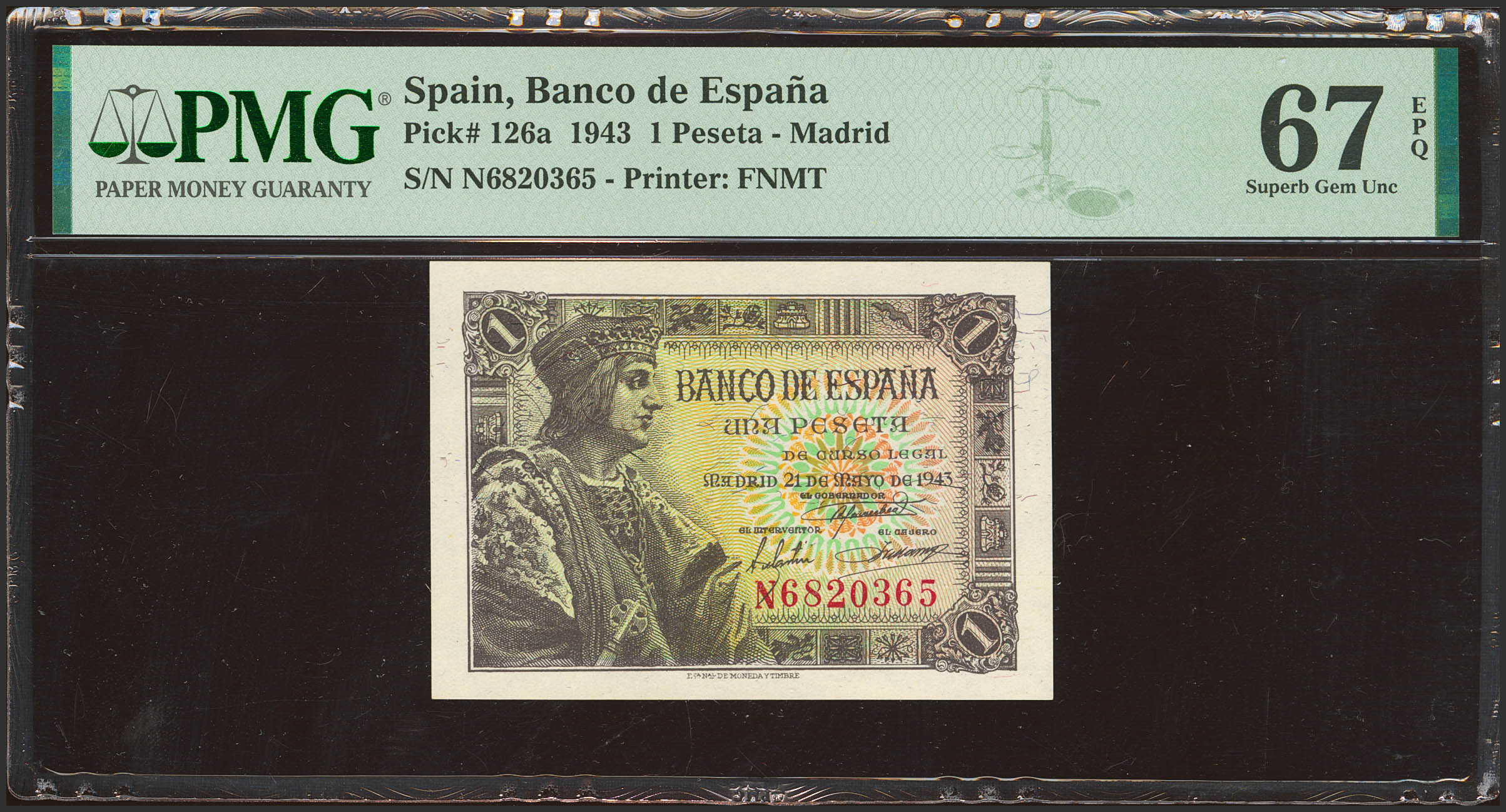 1 Peseta. 21 de Mayo de 1943. Serie N, última serie emitida. (Edifil 2023: 447b, Pick: 126a). Apresto original. SC. Encapsulado PMG67EPQ.