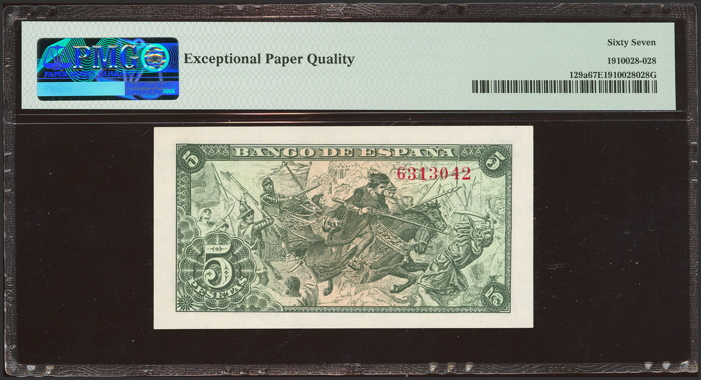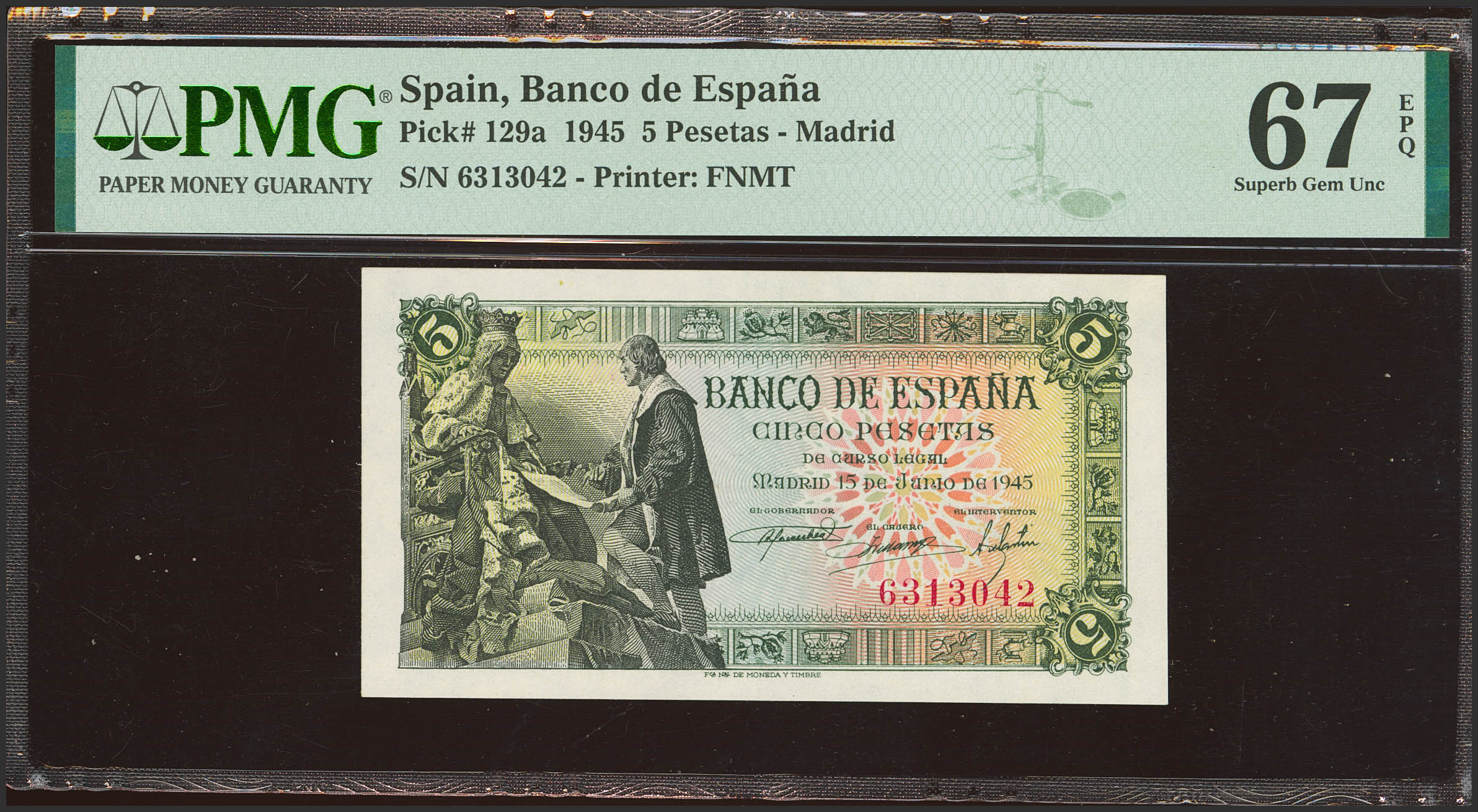 5 Pesetas. 15 de Junio de 1945. Sin serie. (Edifil 2023: 449, Pick: 129a). Raro en esta calidad, apresto original. SC. Encapsulado PMG67EPQ.