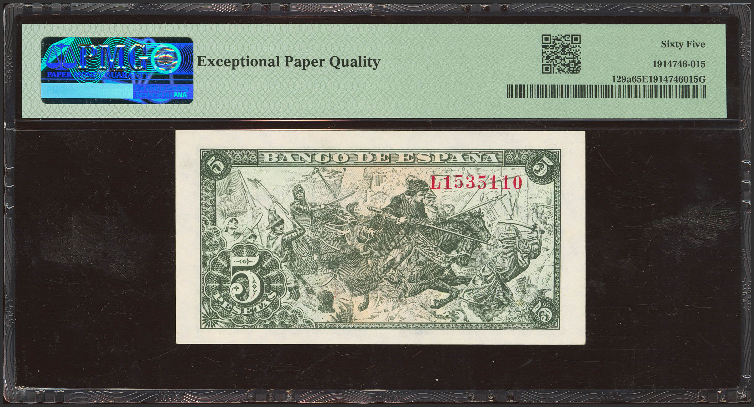 5 Pesetas. 15 de Junio de 1945. Serie L, última serie emitida. (Edifil 2023: 449b, Pick: 129a). Raro, apresto original. SC. Encapsulado PMG65EPQ.