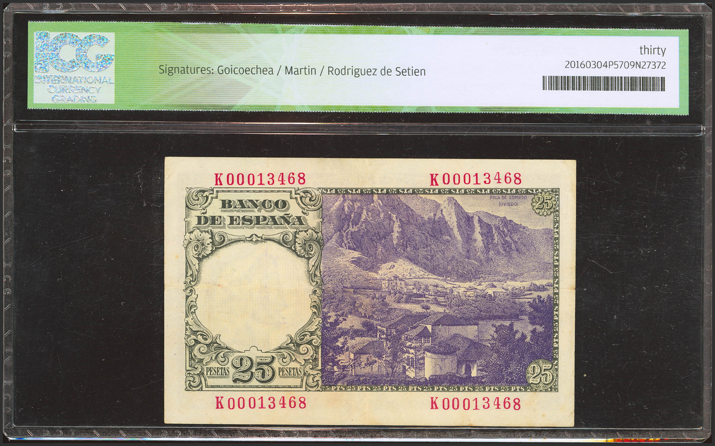 25 Pesetas. 19 de Febrero de 1946. Serie K, última serie emitida. (Edifil 2023: 450b, Pick: 130a). Muy rara serie. MBC+. Encapsulado ICG30.