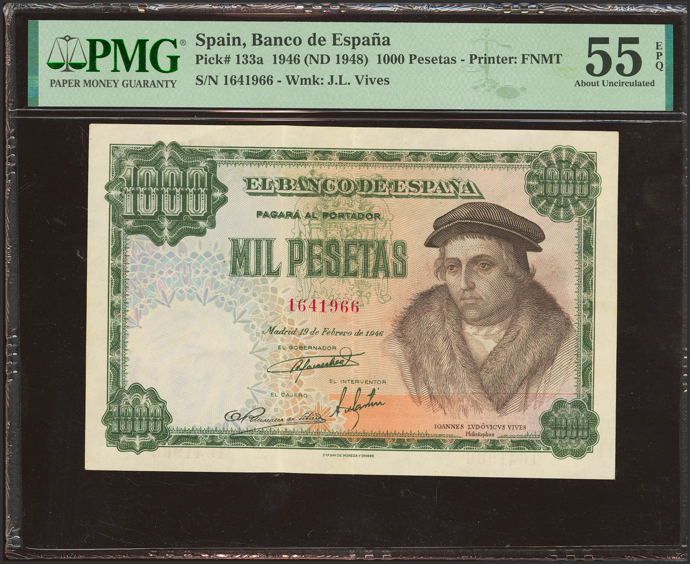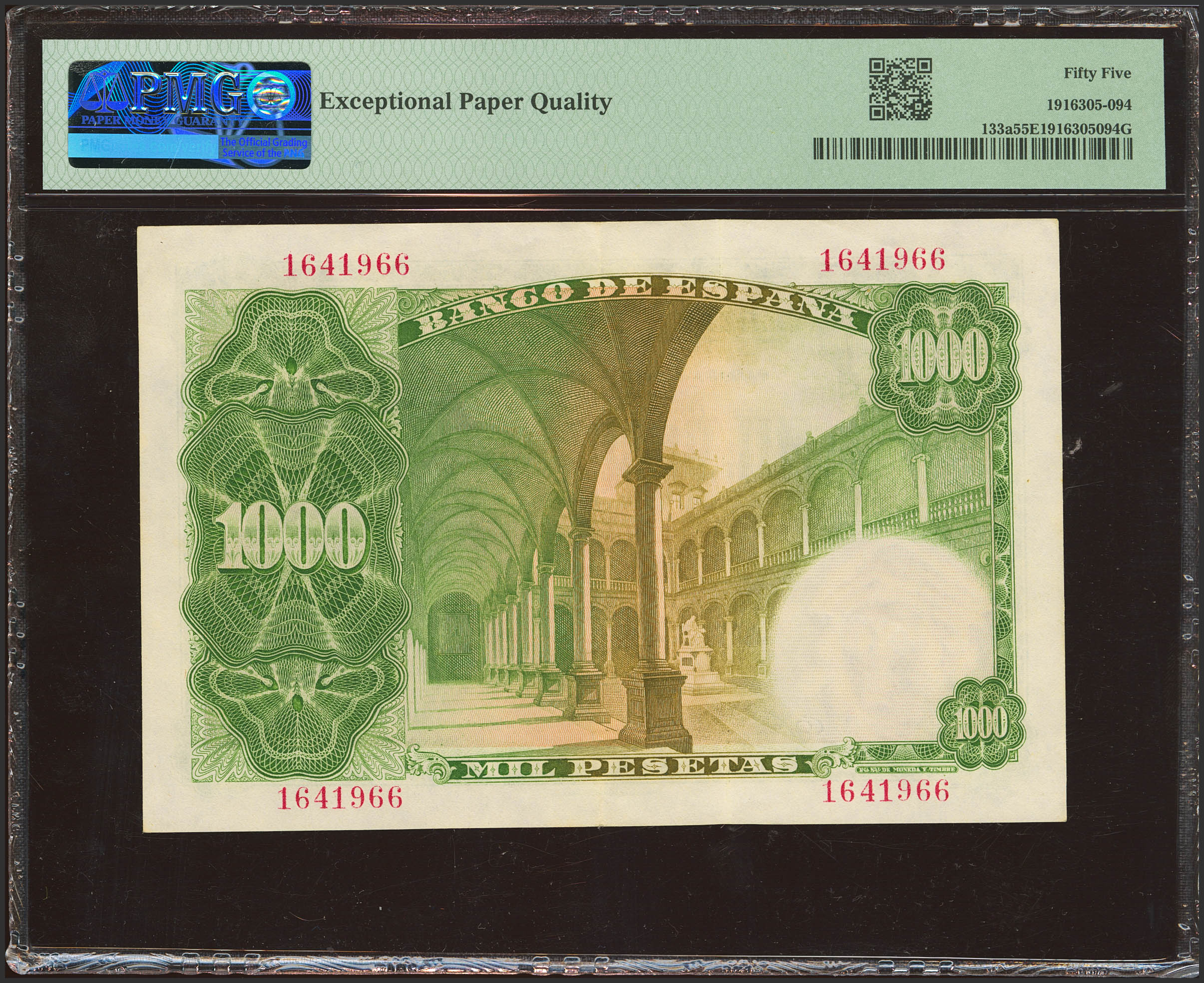 1000 Pesetas. 19 de Febrero de 1946. Sin serie. (Edifil 2023: 453, Pick: 133a). Raro en esta calidad, apresto original. EBC++. Encapsulado PMG55EPQ.