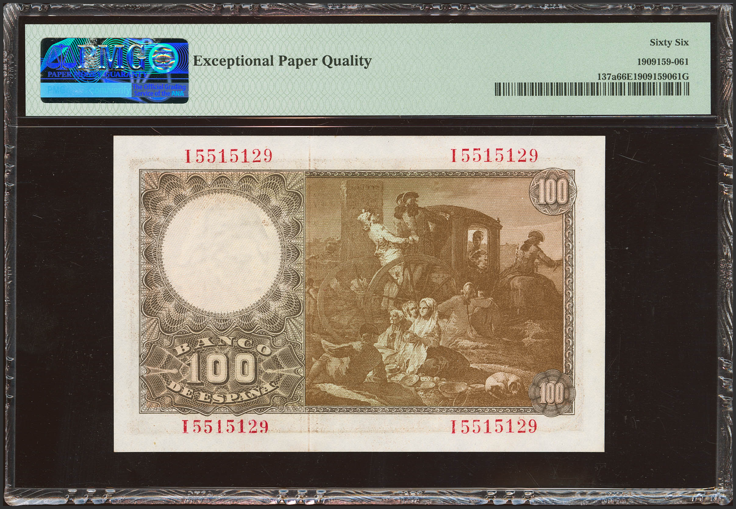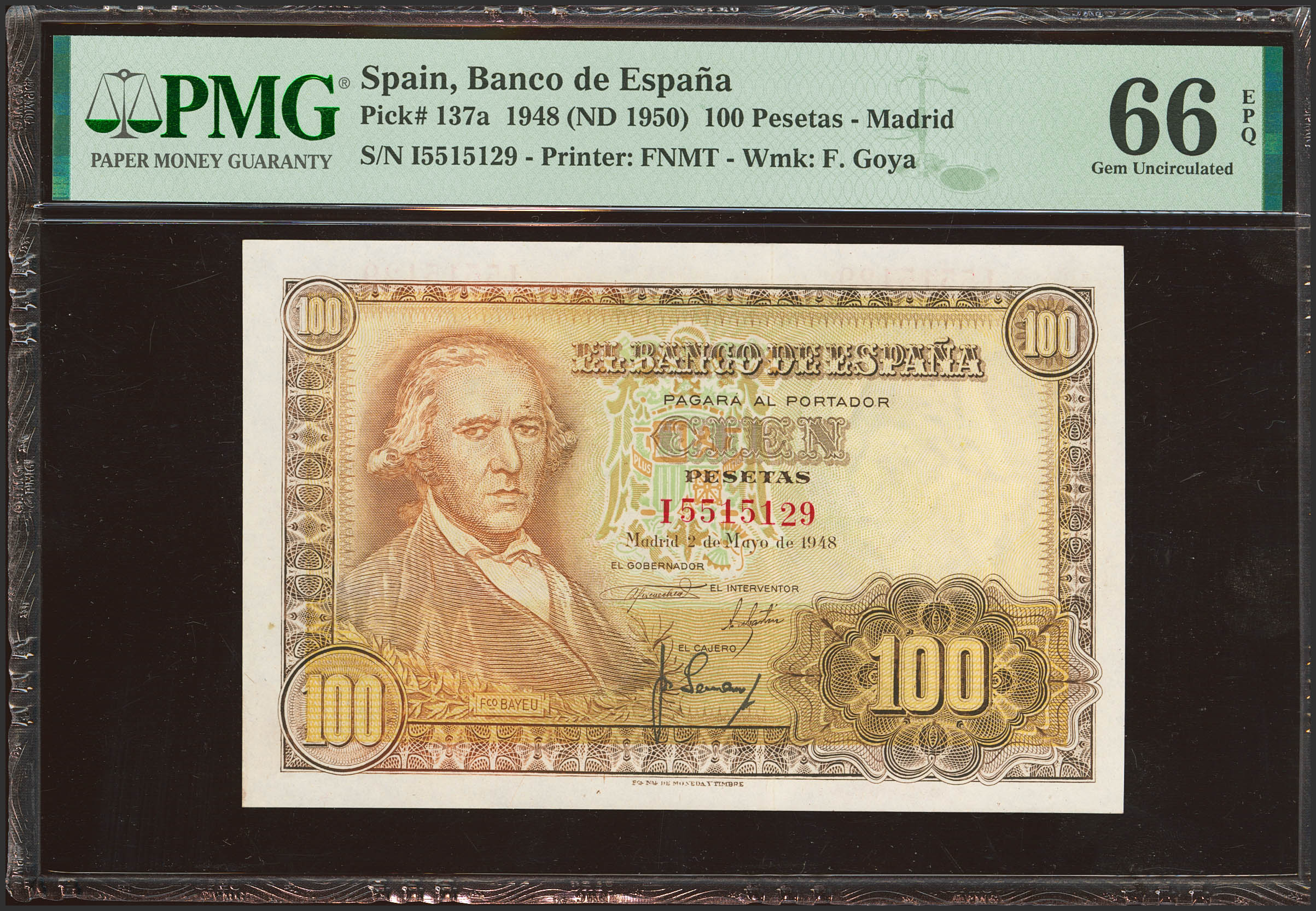 100 Pesetas. 2 de Mayo de 1948. Serie I, última serie emitida. (Edifil 2023: 456b, Pick: 137a). Raro en esta excepcional calidad, apresto original. SC. Encapsulado PMG66EPQ.