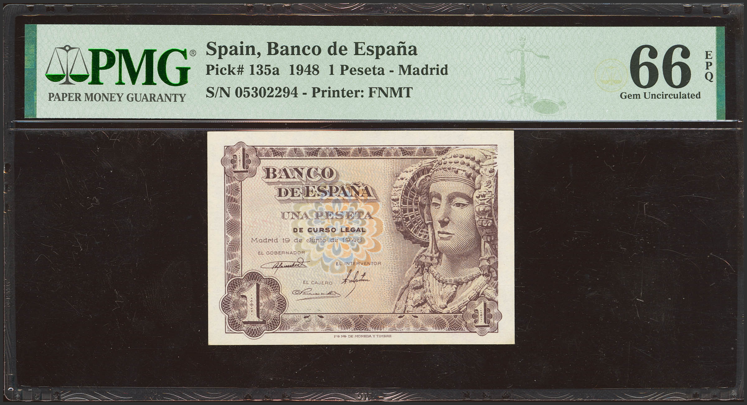 1 Peseta. 19 de Junio de 1948. Sin serie. (Edifil 2021: 457, Pick: 135a). Raro en esta excepcional calidad, apresto original. SC. Encapsulado PMG66EPQ.