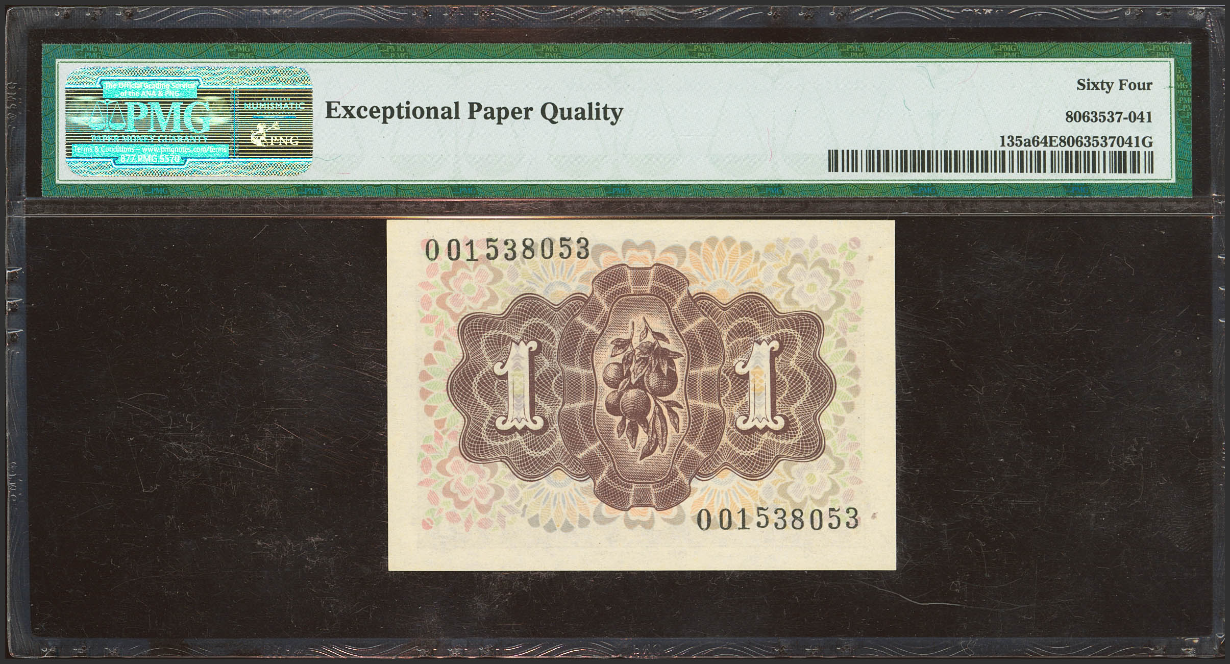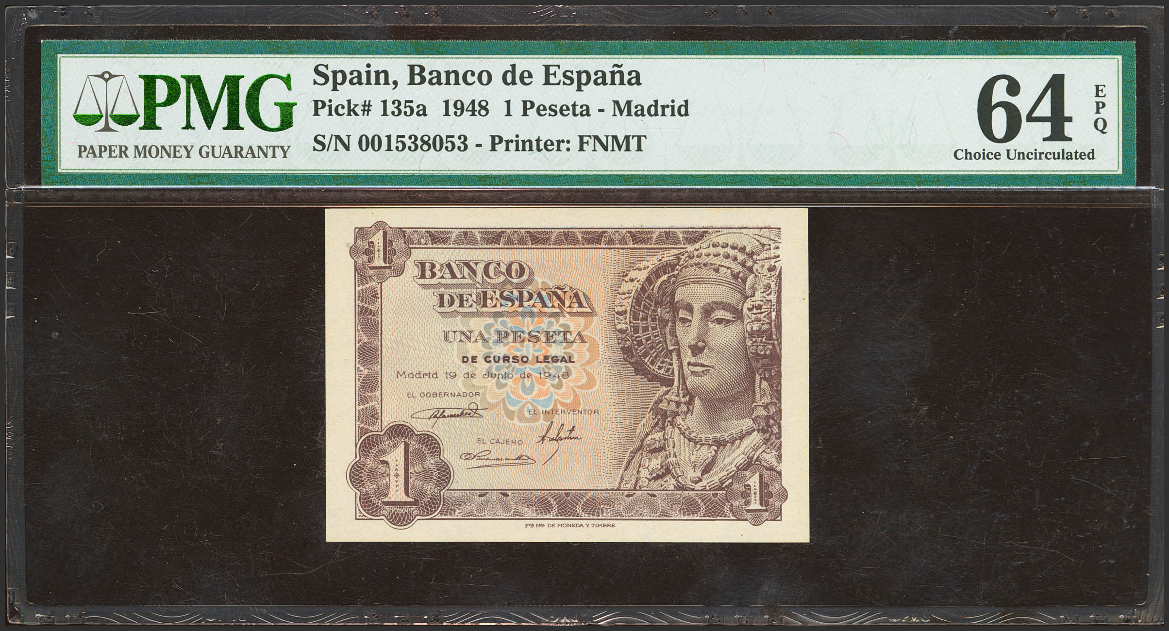 1 Peseta. 19 de Junio de 1948. Serie O, última serie emitida. (Edifil 2023: 457b, Pick: 135a). Raro en esta calidad, apresto original. SC. Encapsulado PMG64EPQ.