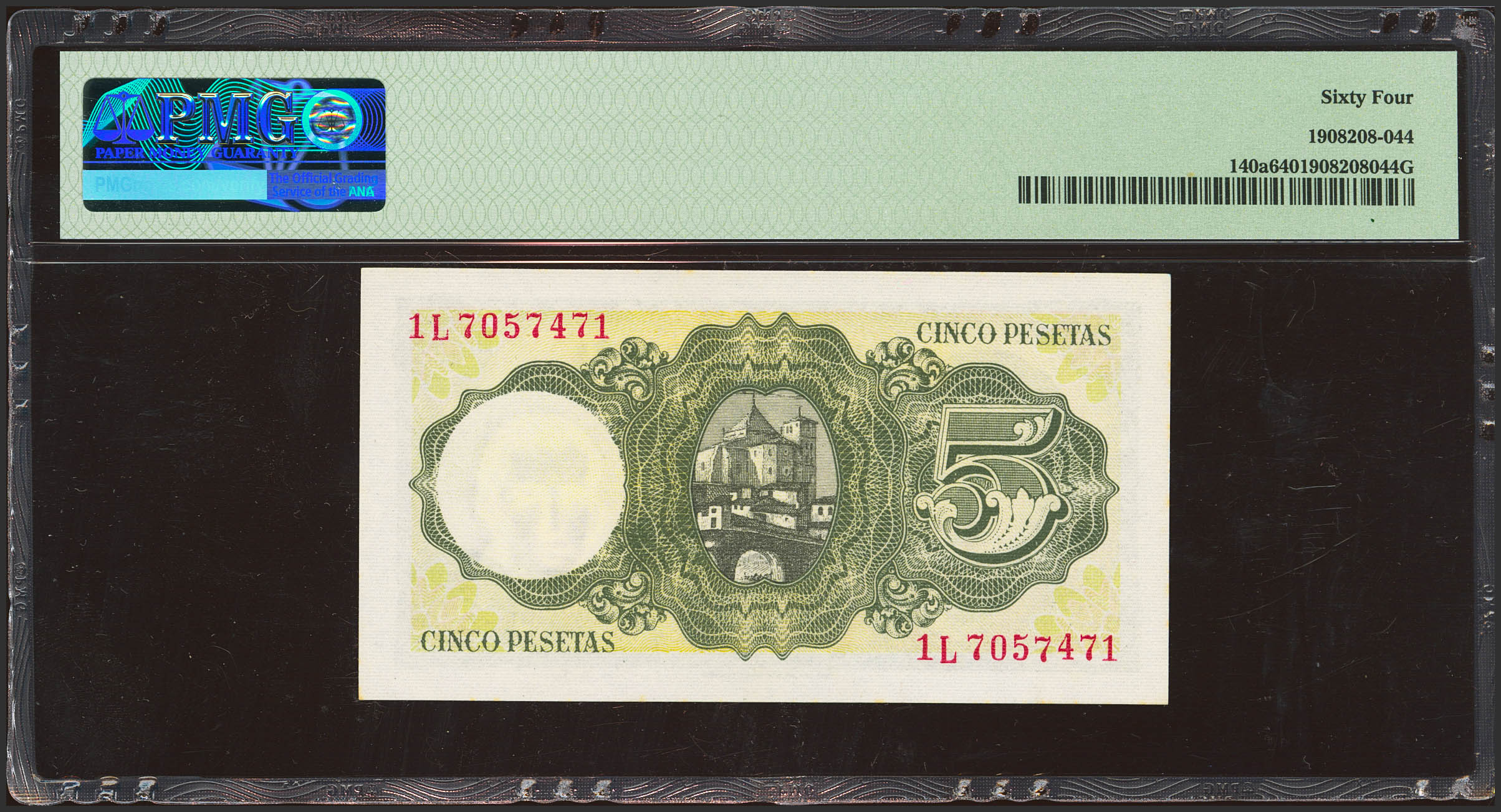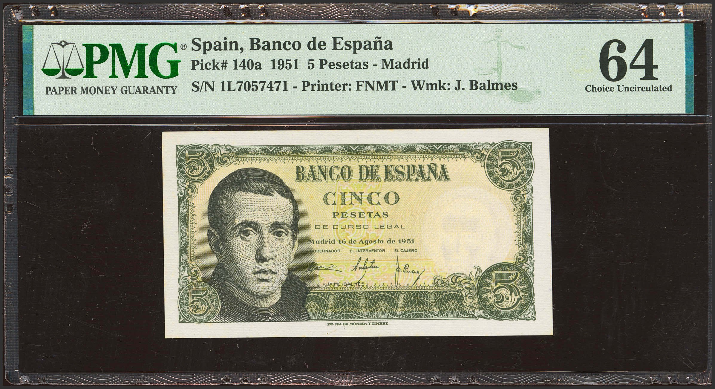 5 Pesetas. 16 de Agosto de 1951. Serie 1L, última serie emitida. (Edifil 2023: 459b, Pick: 140a). SC. Encapsulado PMG64.