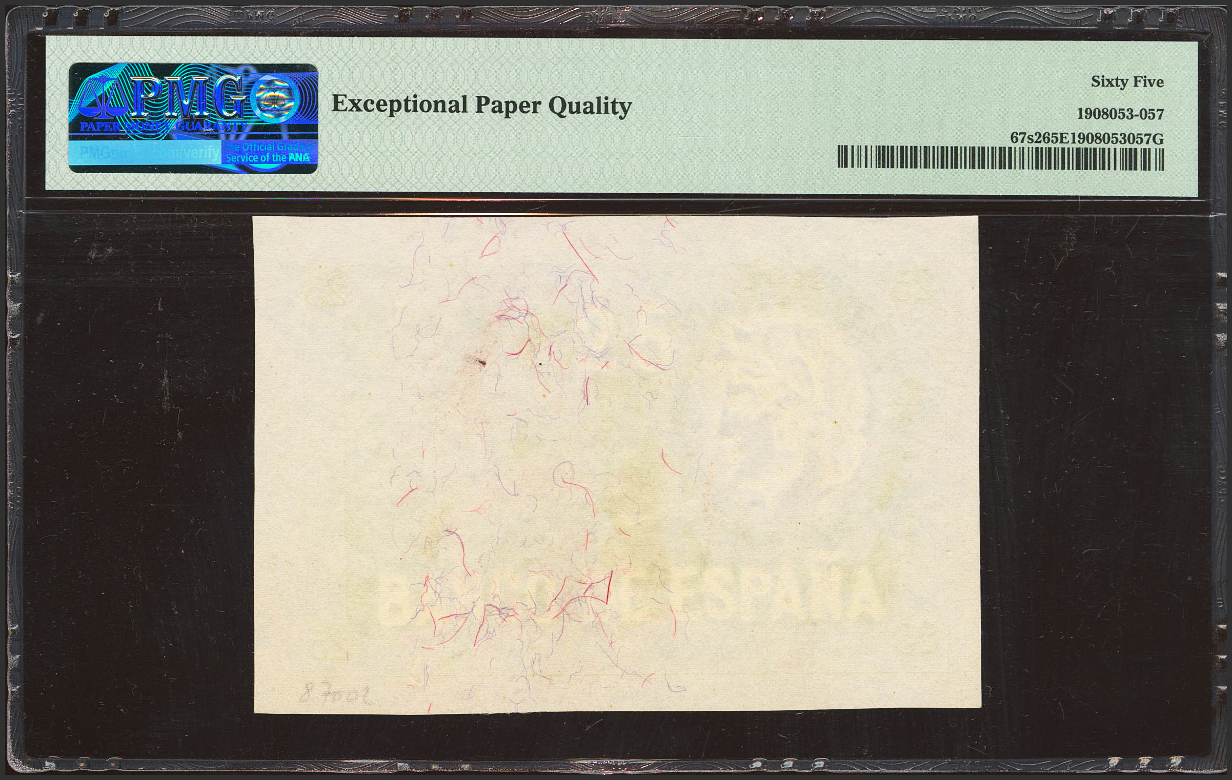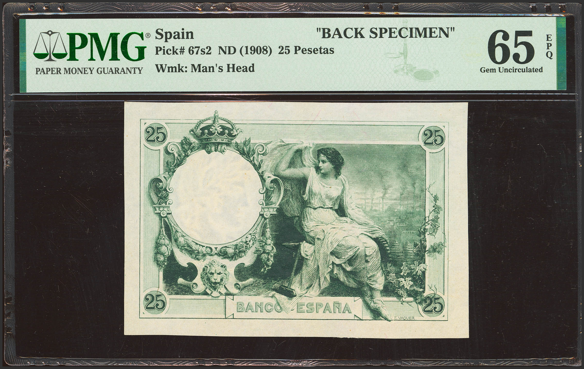 Prueba de color del reverso del 25 Pesetas no emitido en color verde, de la emisión del 1 de Diciembre de 1908. (Edifil 2023: NE14Pb, Pick: 67s2). Apresto original. SC. Encapsulado PMG65EPQ.