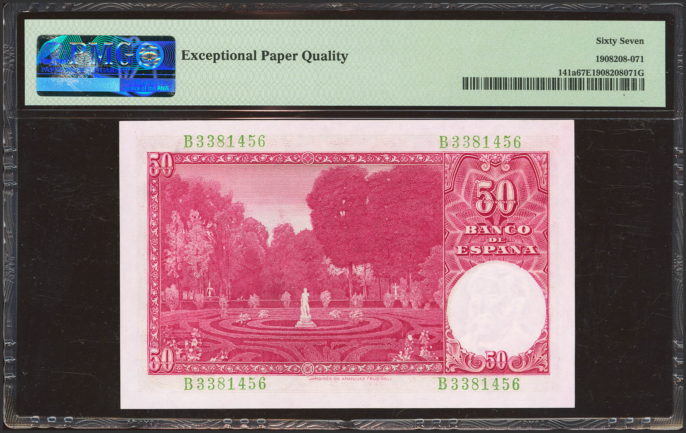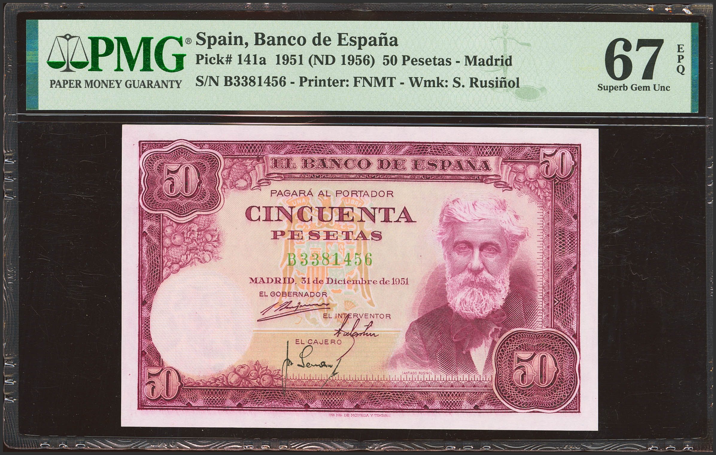 50 Pesetas. 31 de Diciembre de 1951. Serie B. (Edifil 2023: 462a, Pick: 141a). Inusual en esta calidad, apresto original. SC. Encapsulado PMG67EPQ.