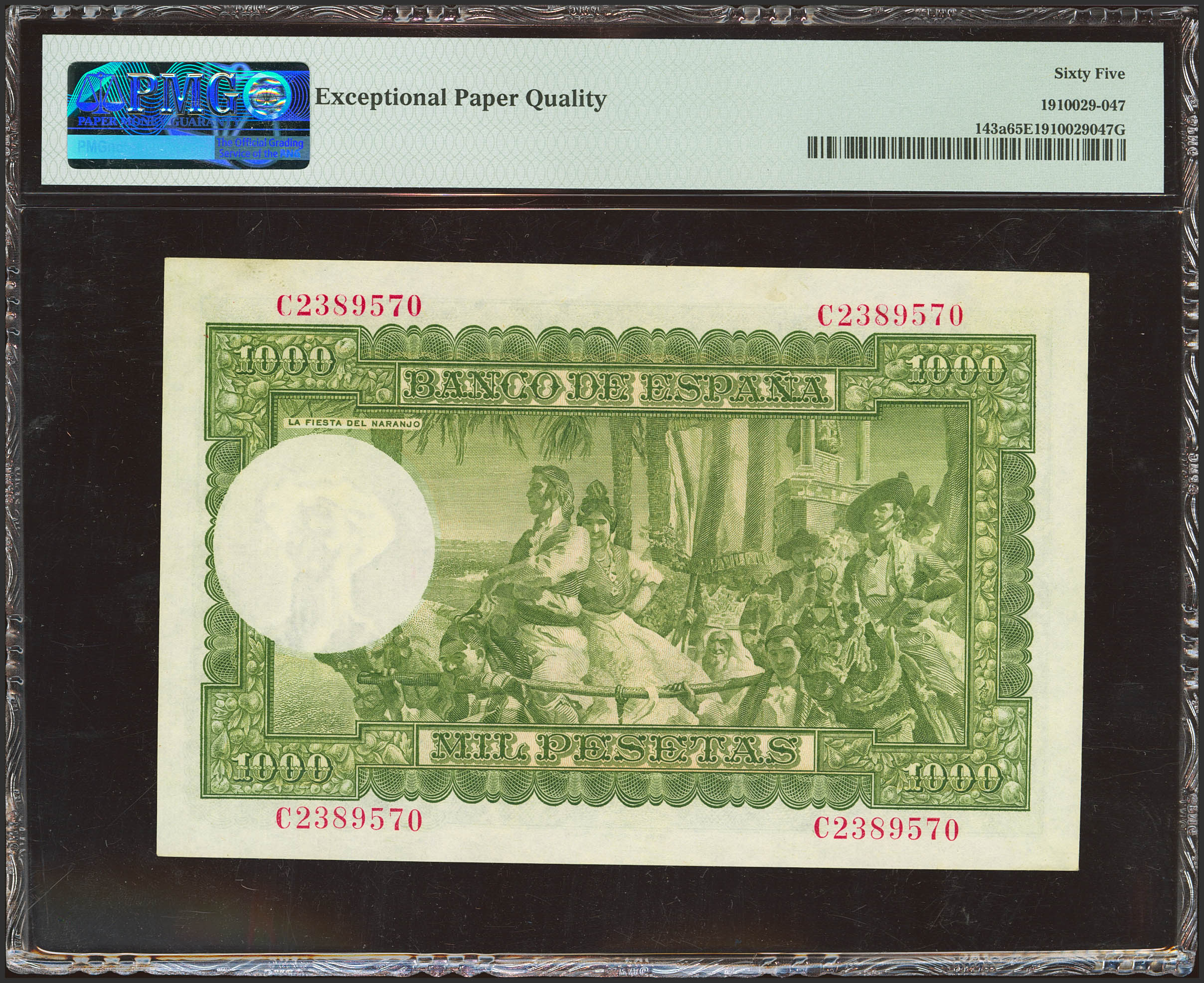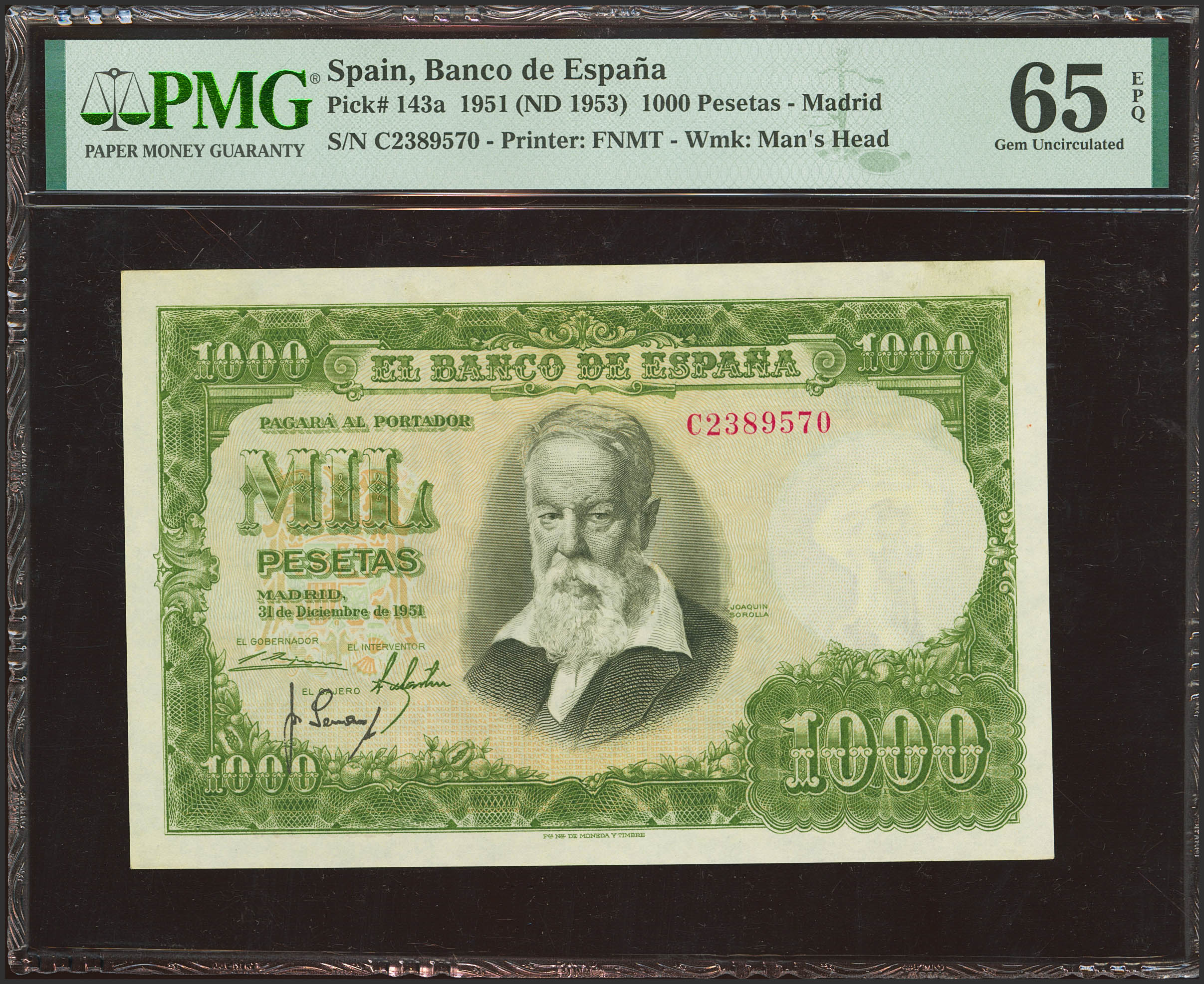 1000 Pesetas. 31 de Diciembre de 1951. Serie C, última serie emitida. (Edifil 2023: 463b, Pick: 143a). Raro en esta excepcional calidad, apresto original. SC. Encapsulado PMG65EPQ.