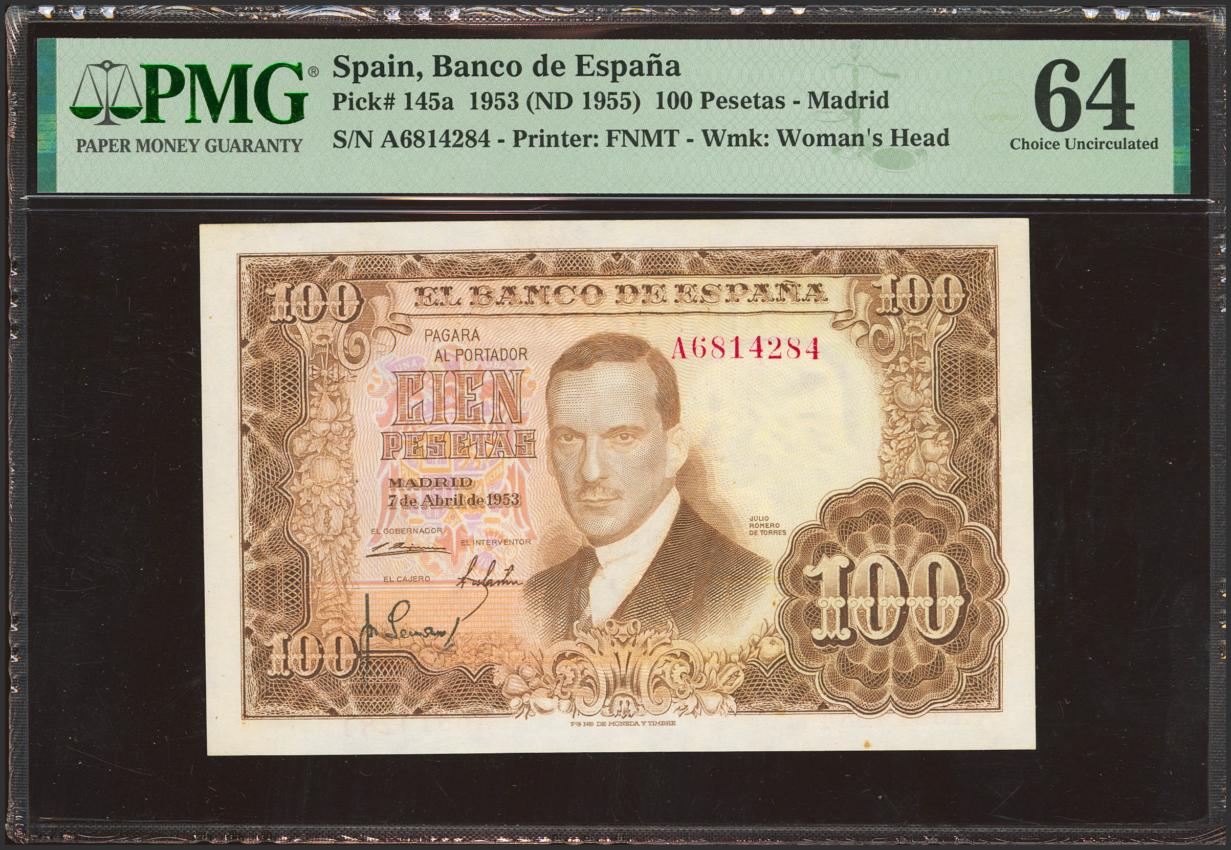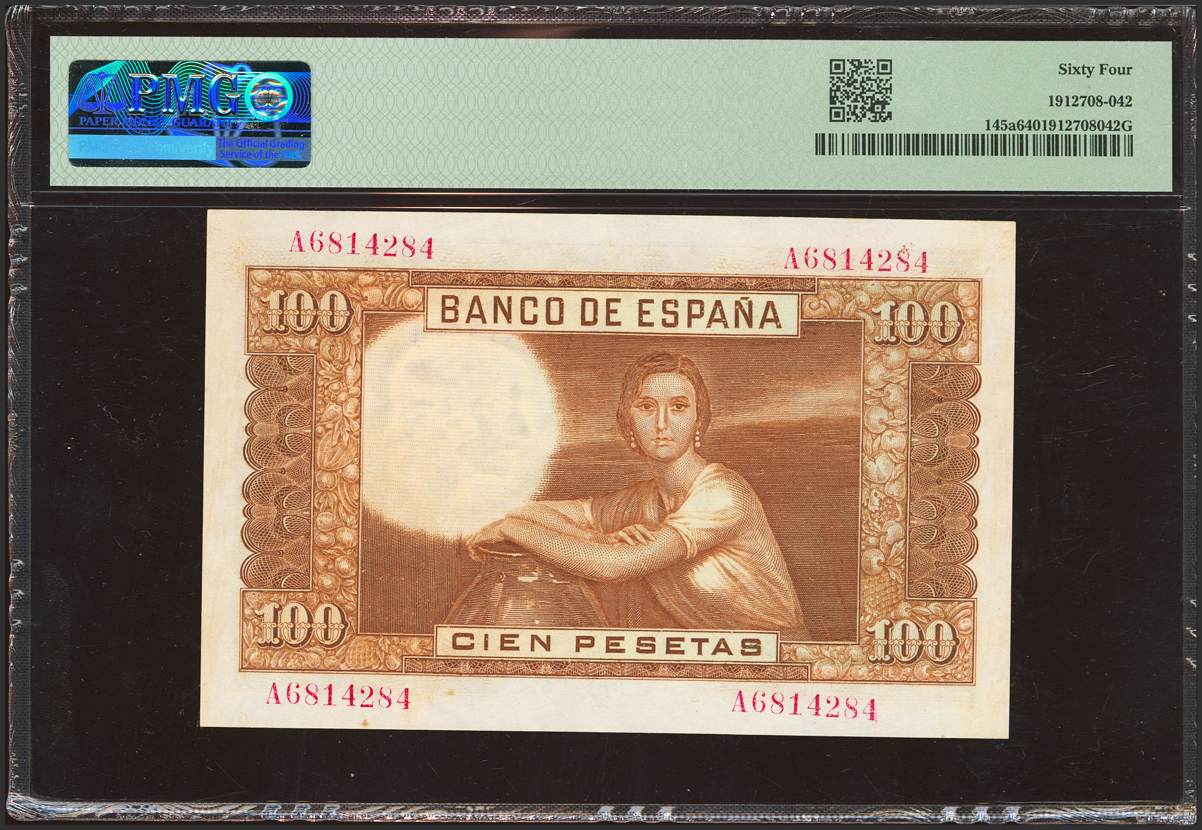100 Pesetas. 7 de Abril de 1953. Serie A. (Edifil 2023: 464a, Pick: 145a). Inusual. Encapsulado PMG64.