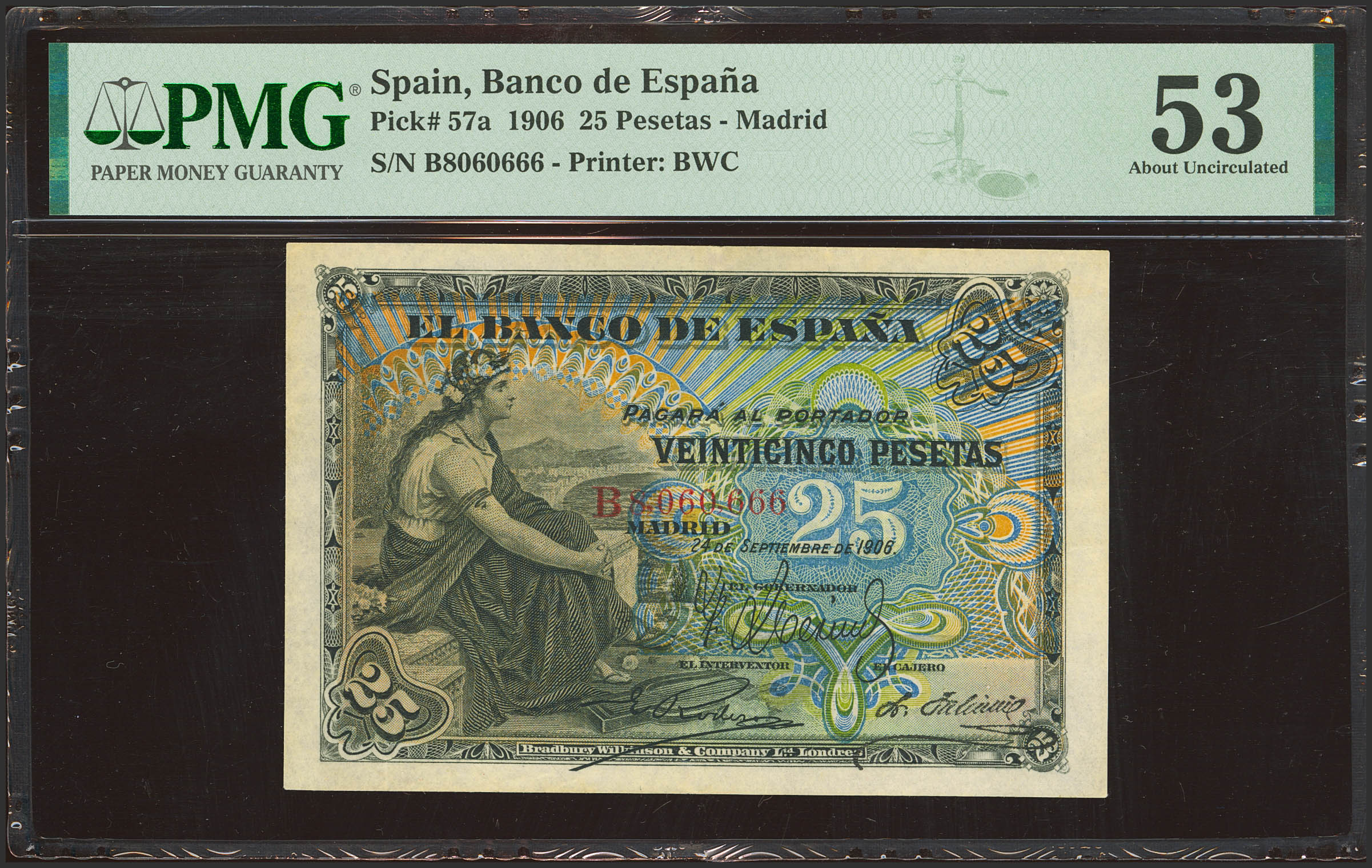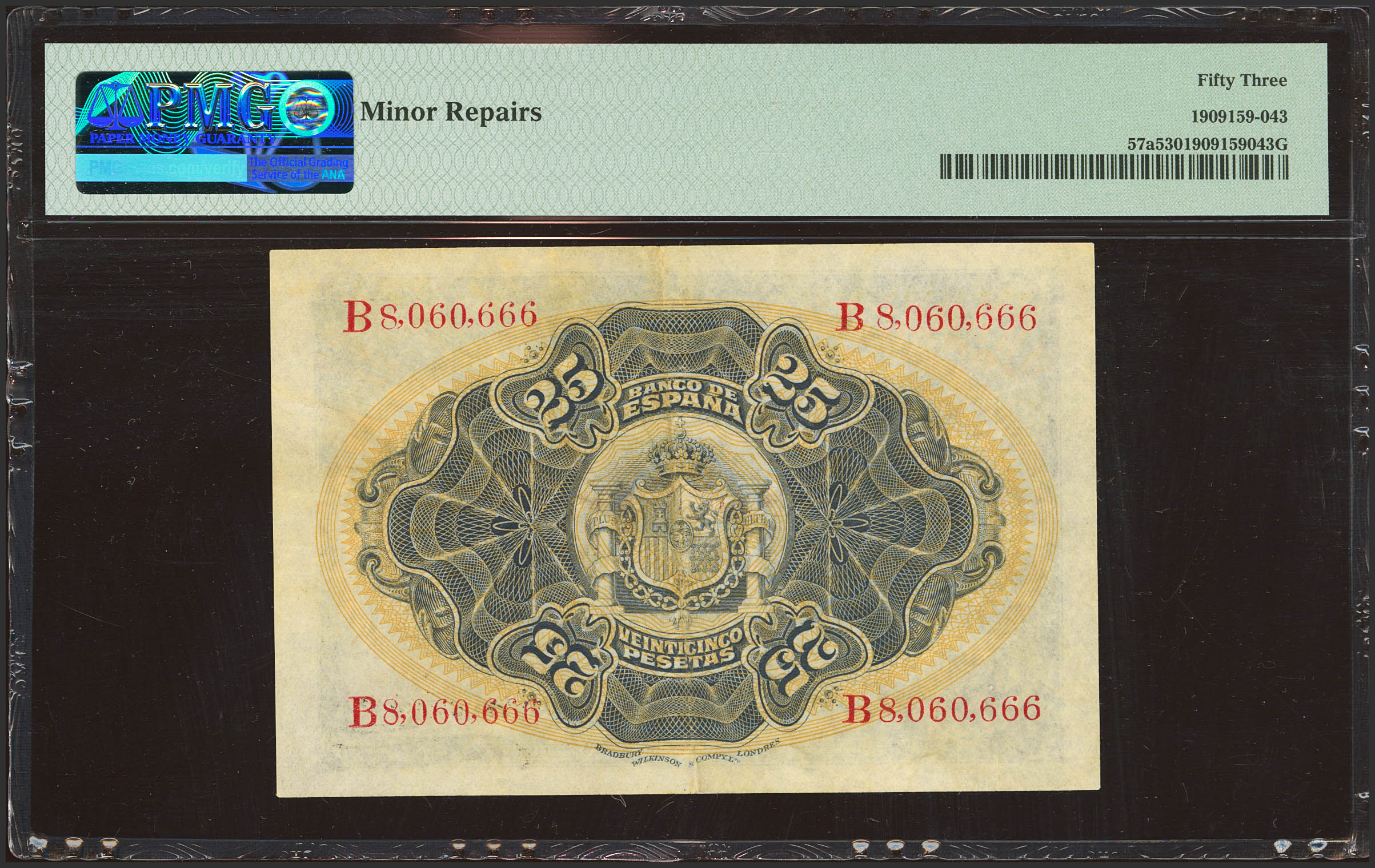 25 Pesetas. 24 de Septiembre de 1906. Serie B. (Edifil 2023: 314a, Pick: 57a). Mínimamente reparado. EBC-. Encapsulado PMG53 (minor repairs).