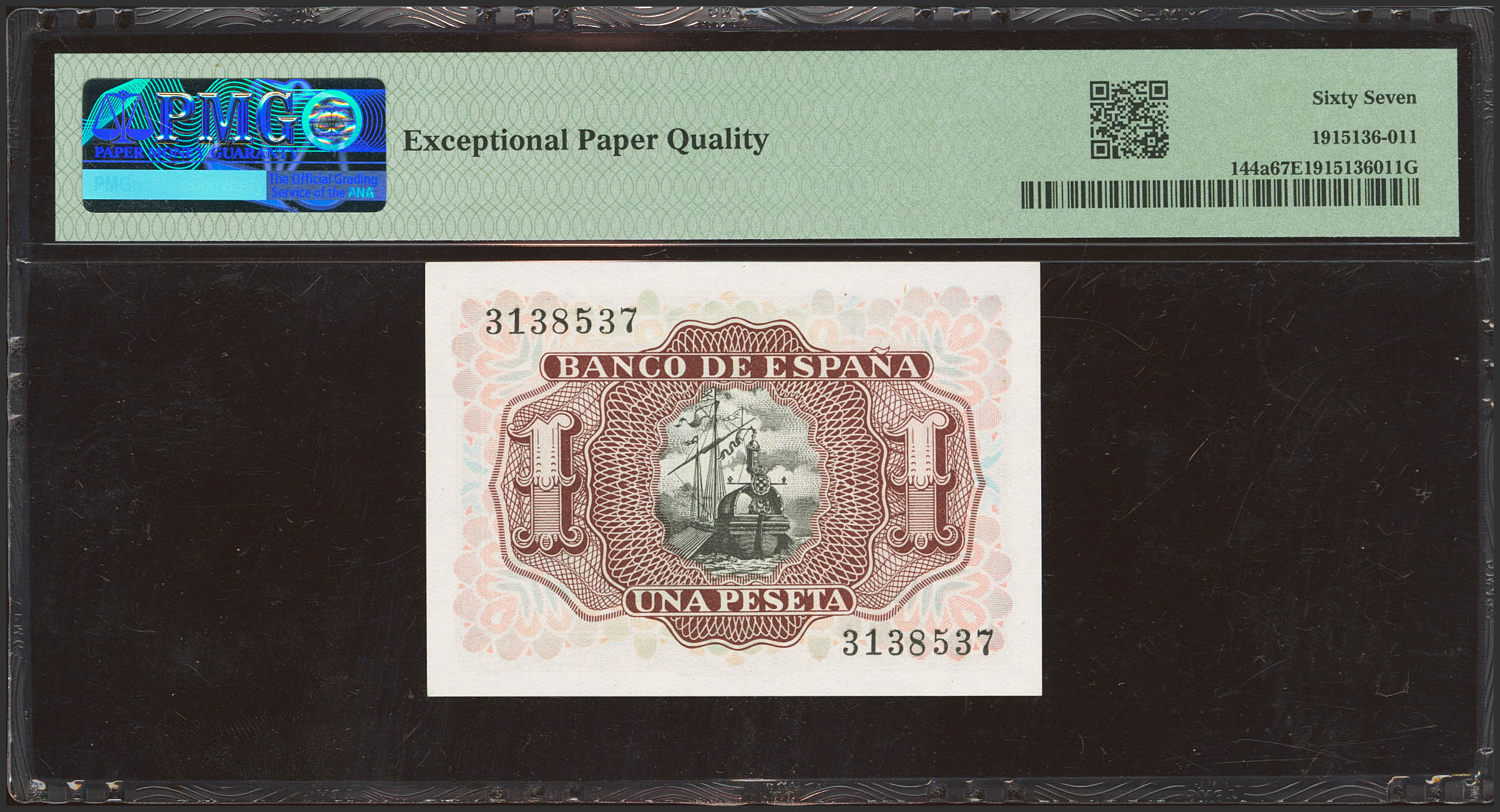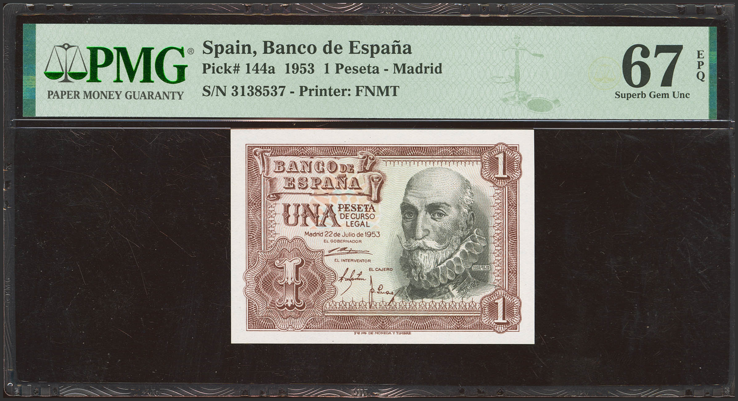 1 Peseta. 22 de Julio de 1953. Sin serie. (Edifil 2023: 465, Pick: 144a). Raro en esta calidad, apresto original. SC. Encapsulado PMG67EPQ.