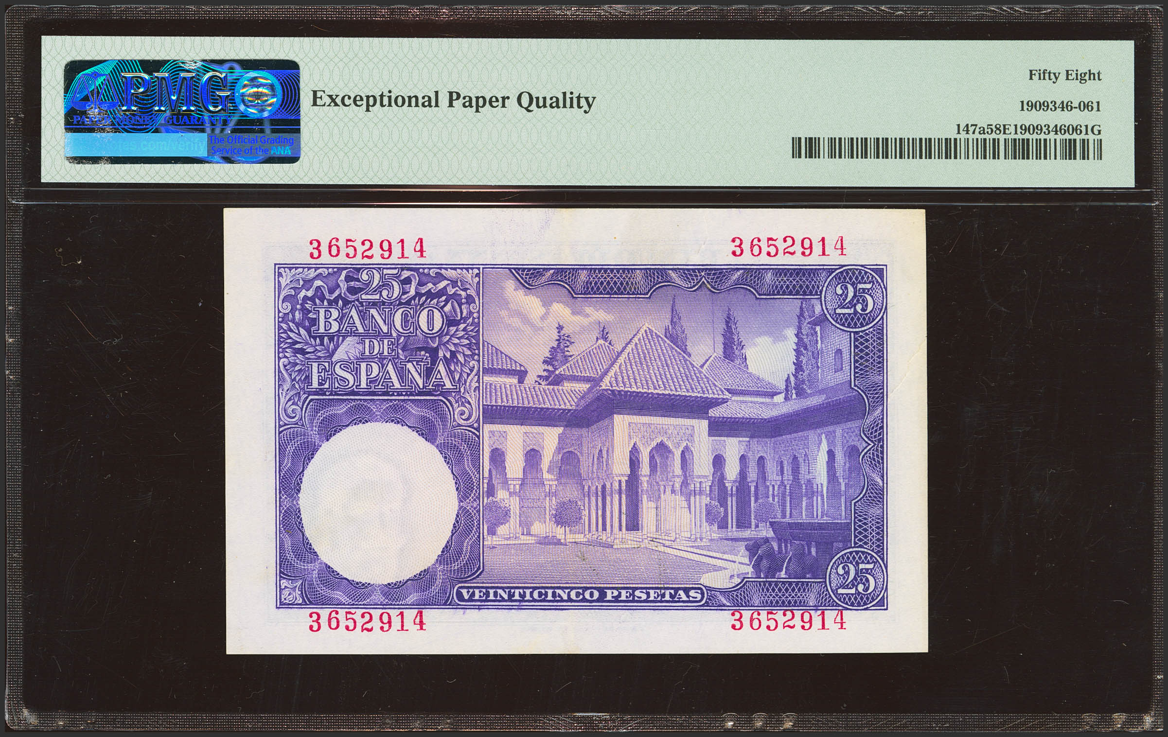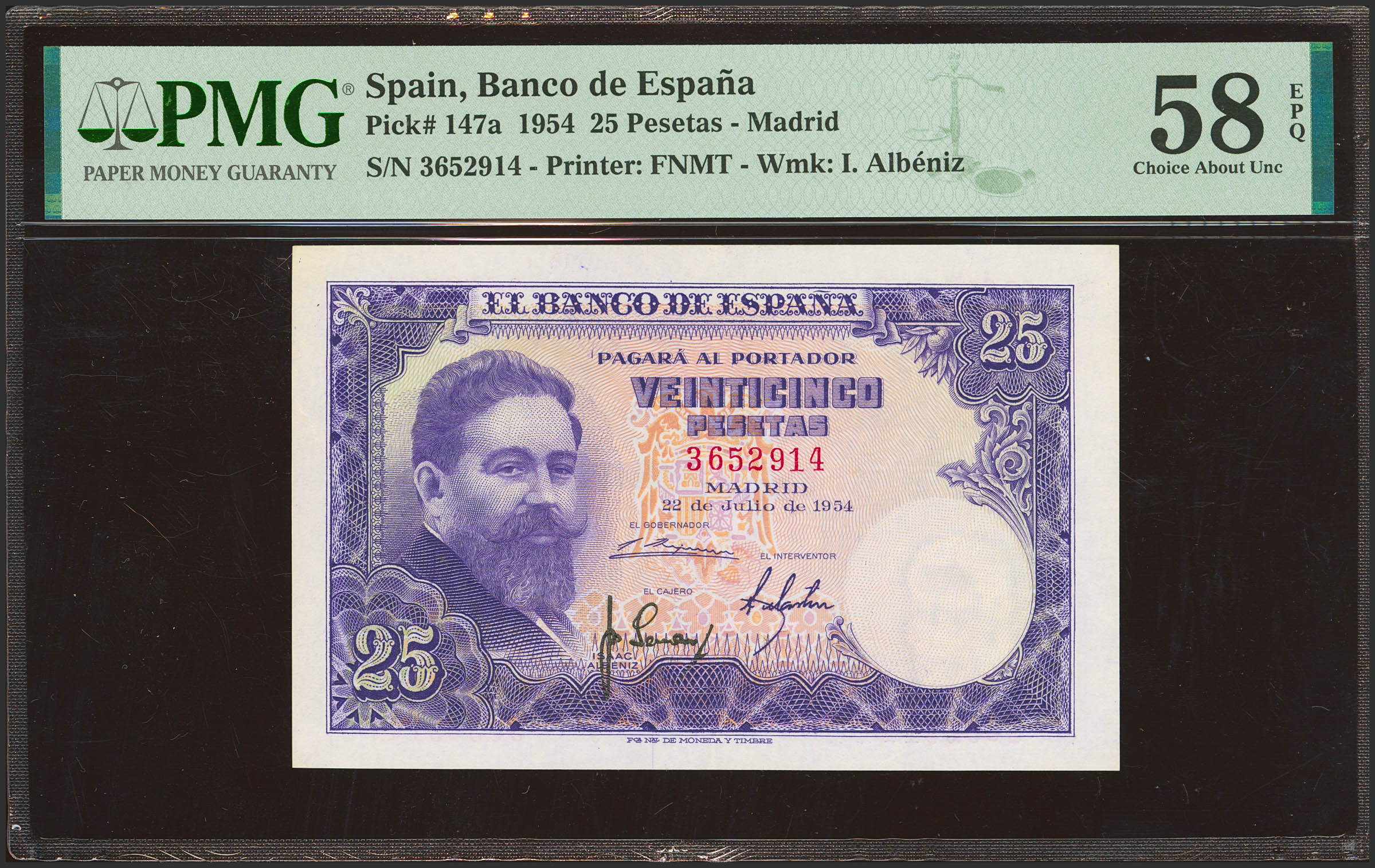 25 Pesetas. 22 de Julio de 1953. Sin serie. (Edifil 2023: 467, Pick: 147a). Apresto original. EBC+++. Encapsulado PMG58EPQ.