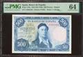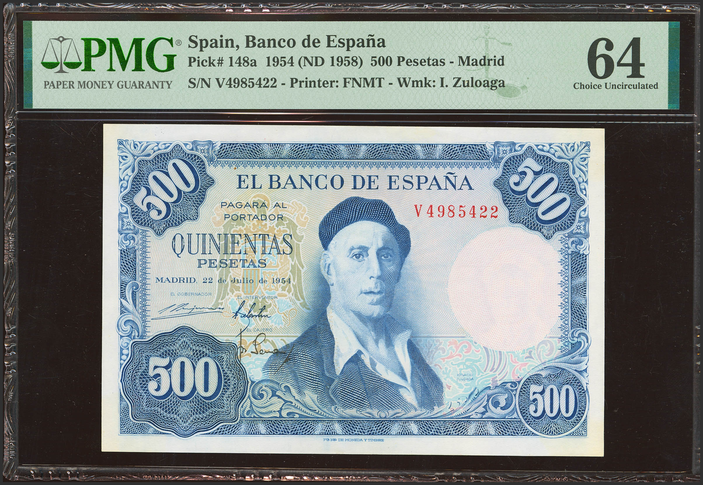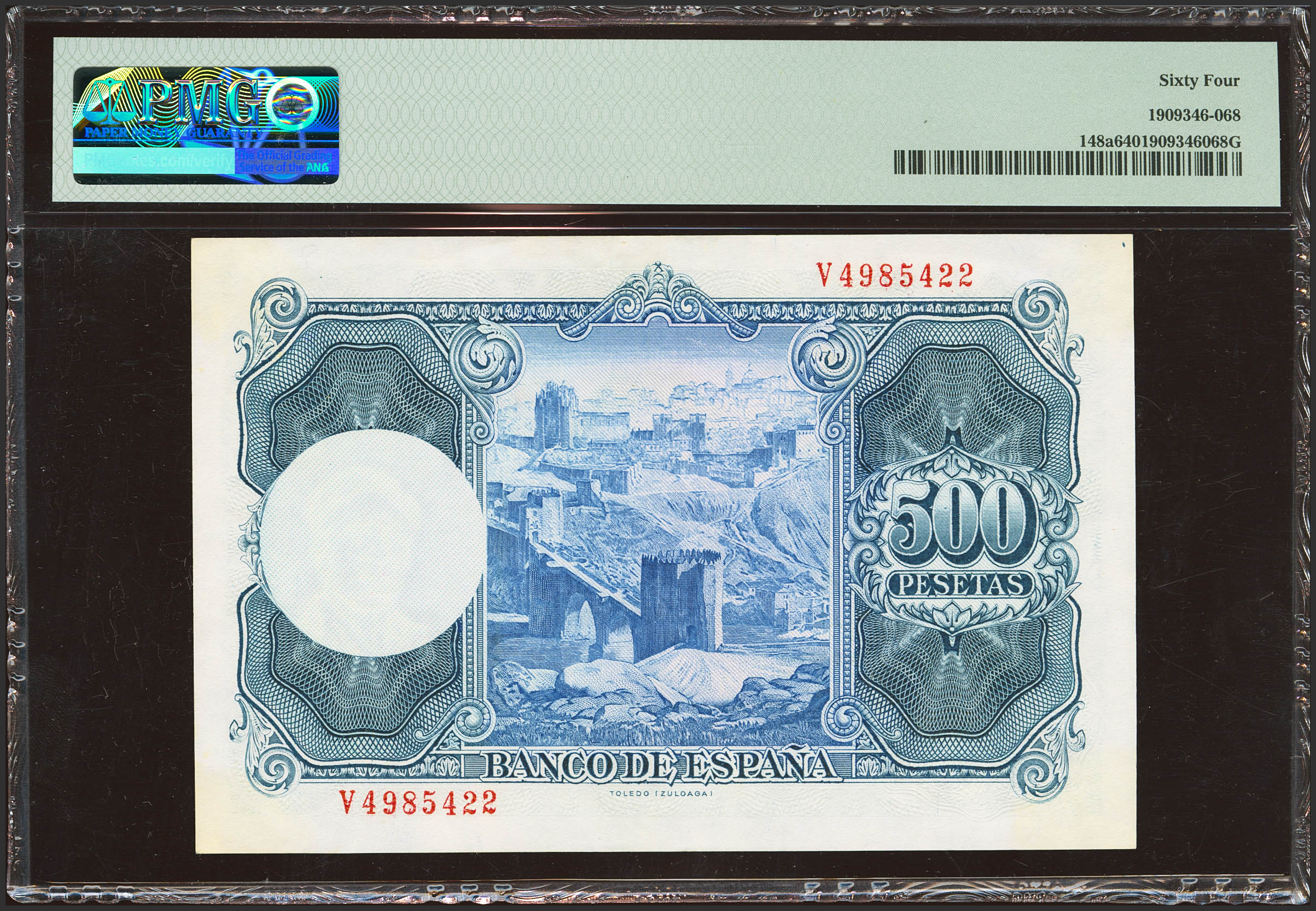 500 Pesetas. 22 de Julio de 1954. Serie V, última serie emitida. (Edifil 2023: 468c, Pick: 148a). Inusual serie. SC. Encapsulado PMG64.
