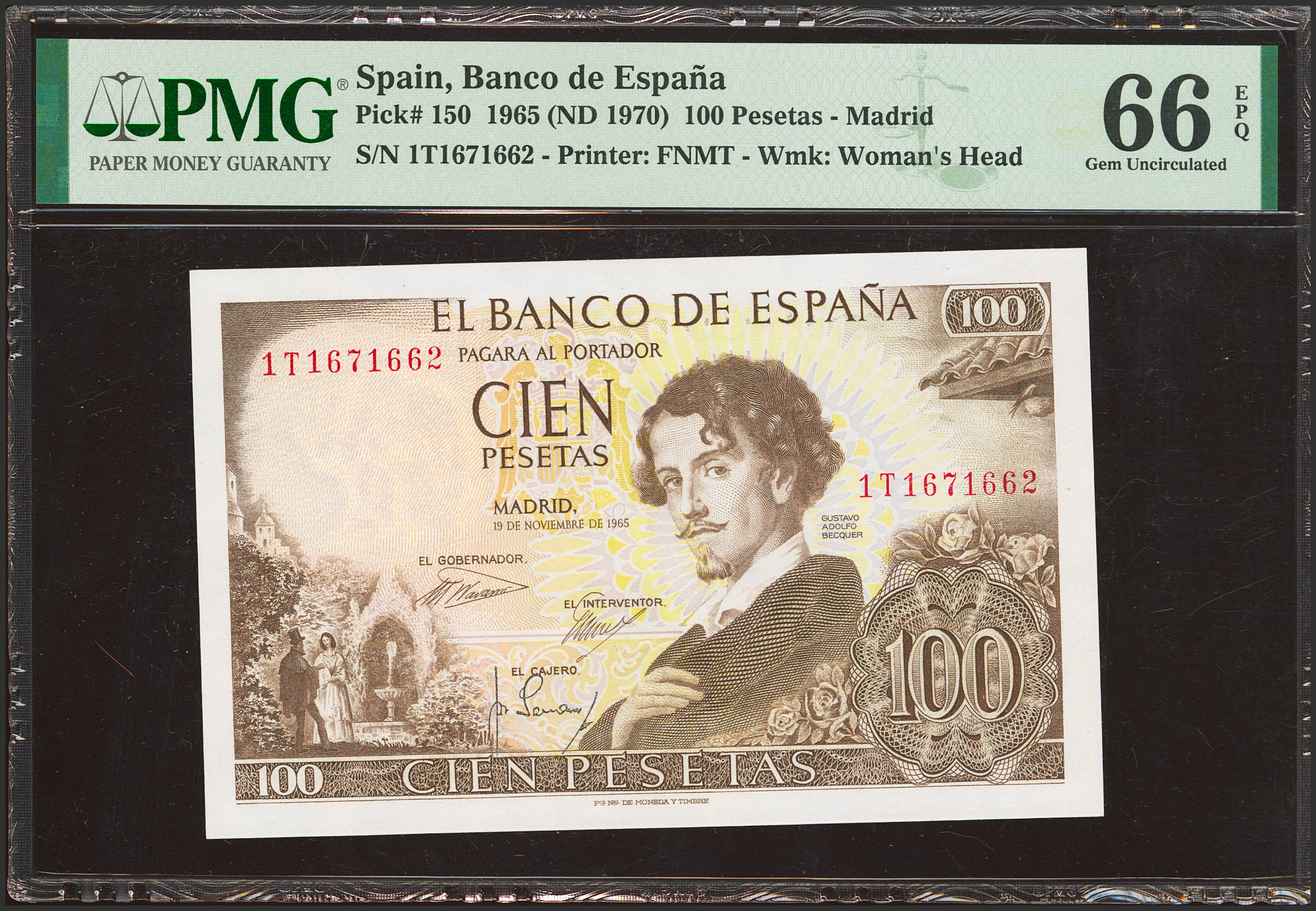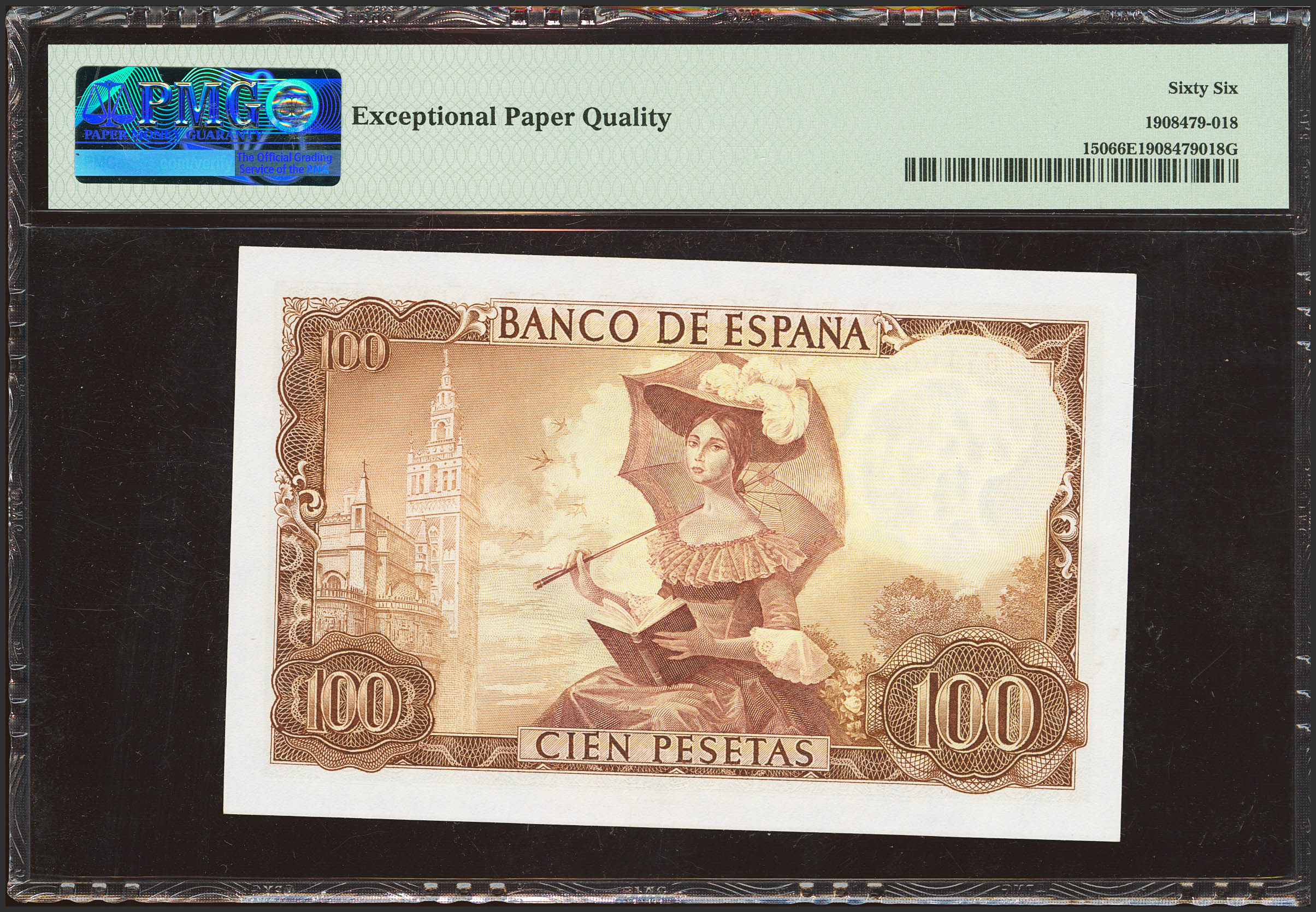 100 Pesetas. 19 de Noviembre de 1965. Serie 1T, última serie emitida. (Edifil 2023: 470b, Pick: 150). Inusual, apresto original. SC. Encapsulado PMG66EPQ.
