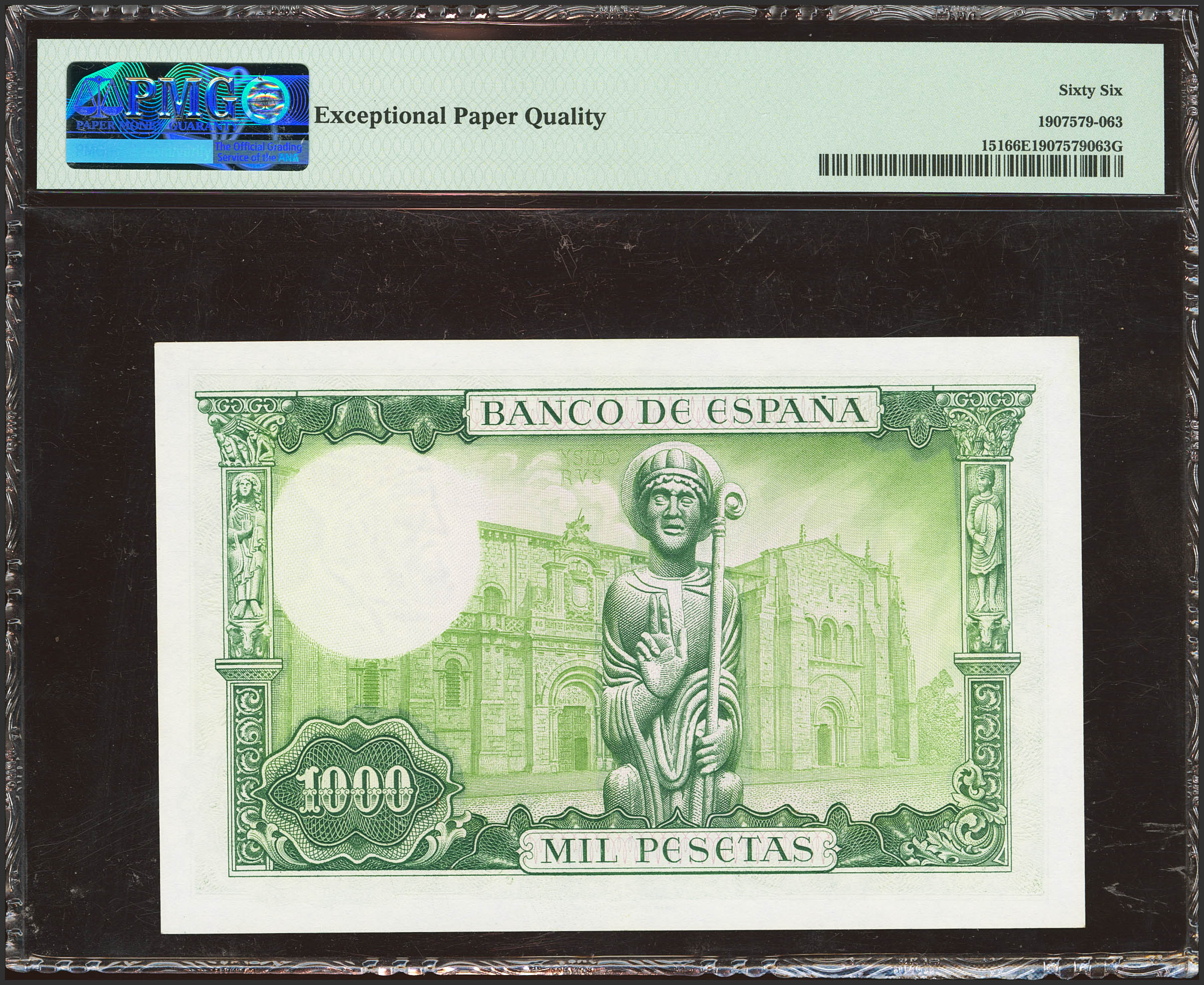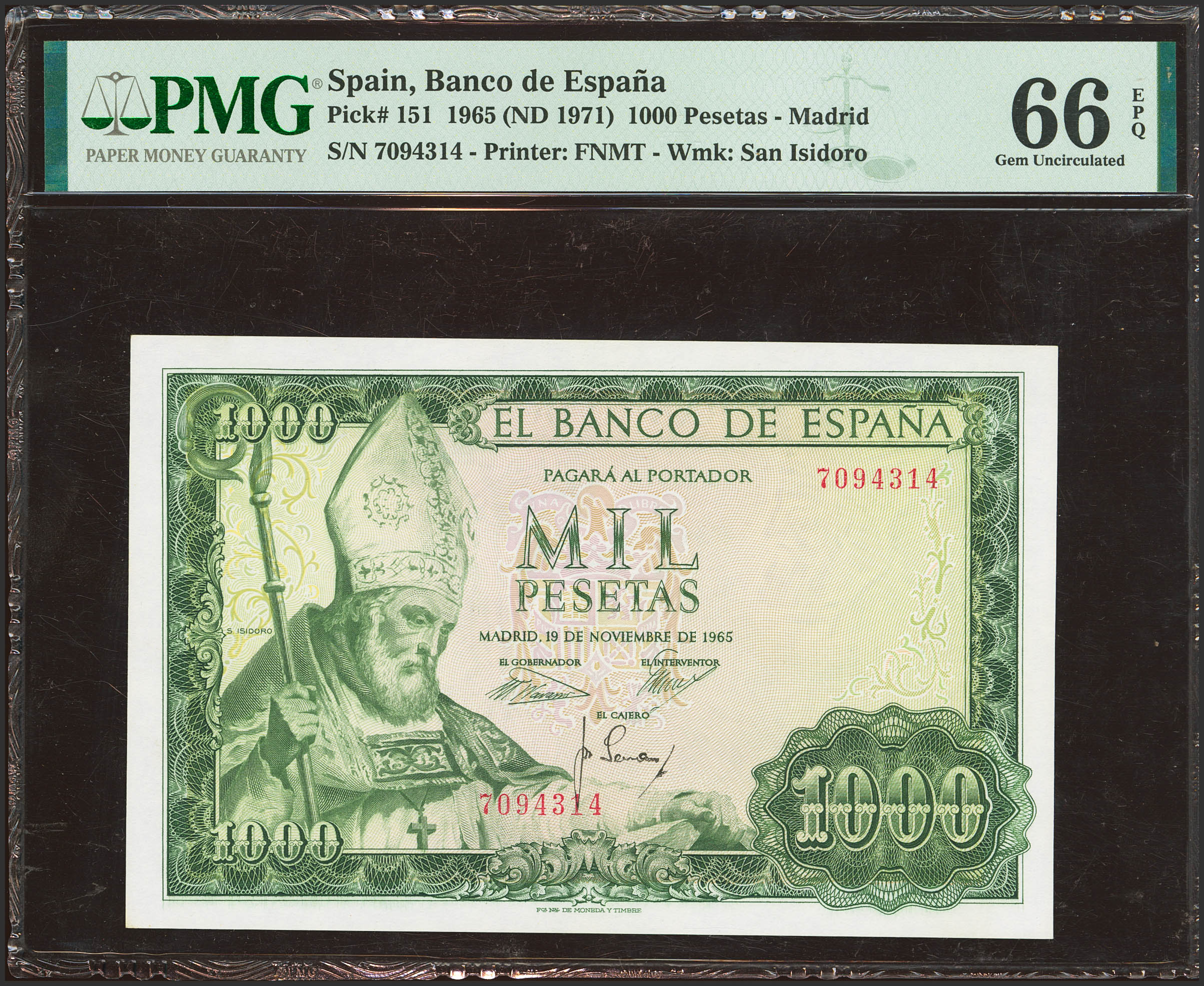1000 Pesetas. 19 de Noviembre de 1965. Sin serie. (Edifil 2023: 471, Pick: 151). Rarísimo en esta excepcional calidad, apresto original. SC. Encapsulado PMG66EPQ.