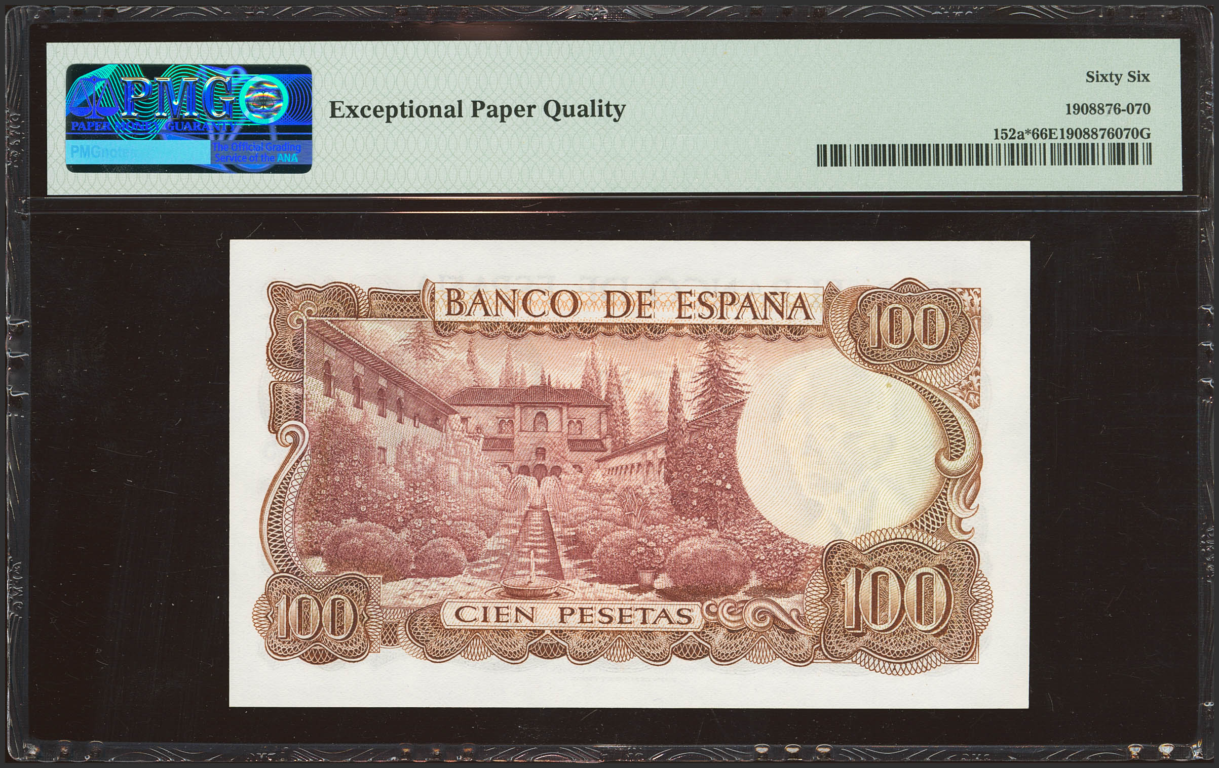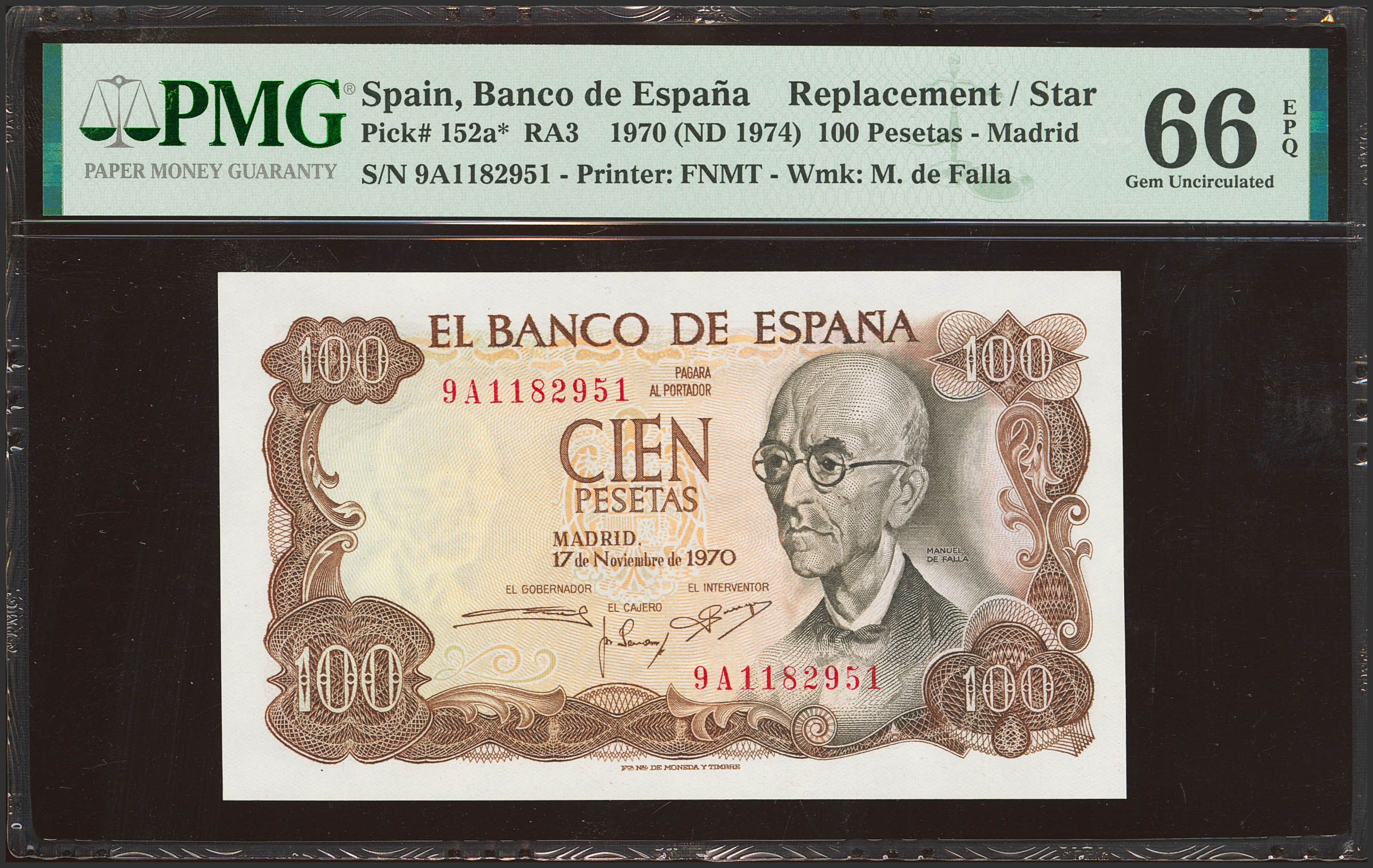 100 Pesetas. 17 de Noviembre de 1970. Serie especial 9A. (Edifil 2023: 472d, Pick: 152a*). Inusual en esta calidad, apresto original. SC. Encapsulado PMG66EPQ.