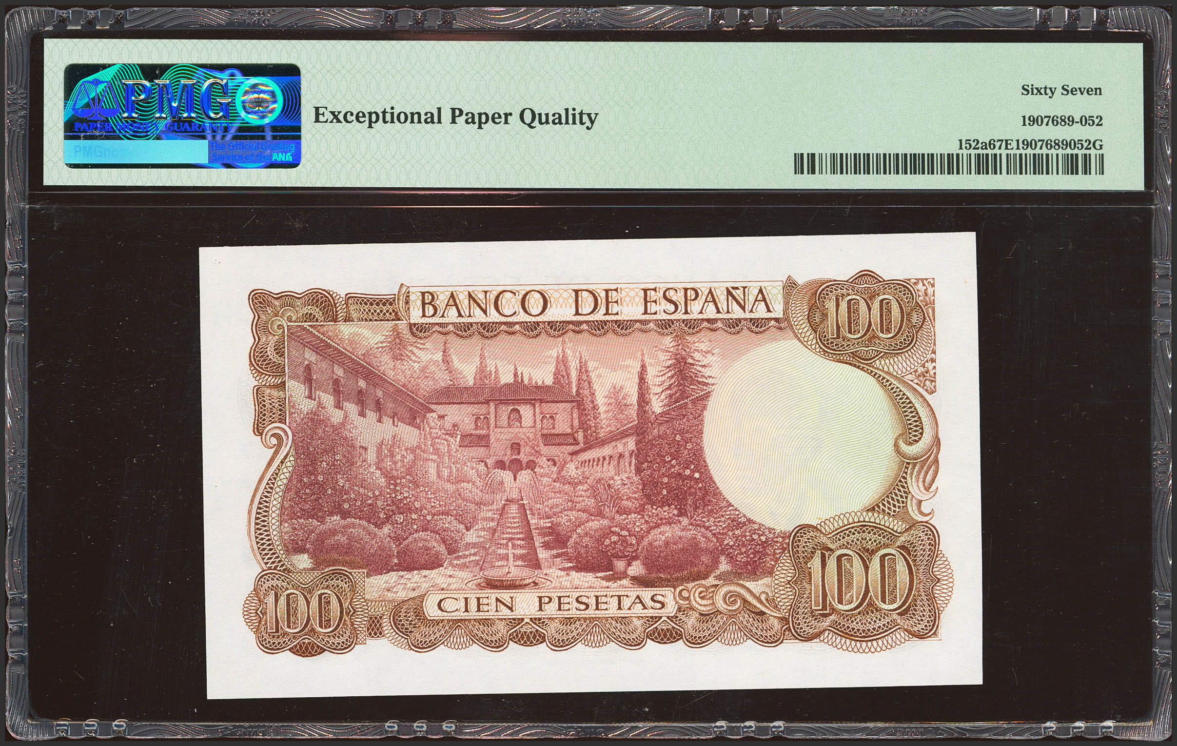 100 Pesetas. 17 de Noviembre de 1970. Sin serie. (Edifil 2023: 472, Pick: 152a). Apresto original. SC. Encapsulado PMG67EPQ.