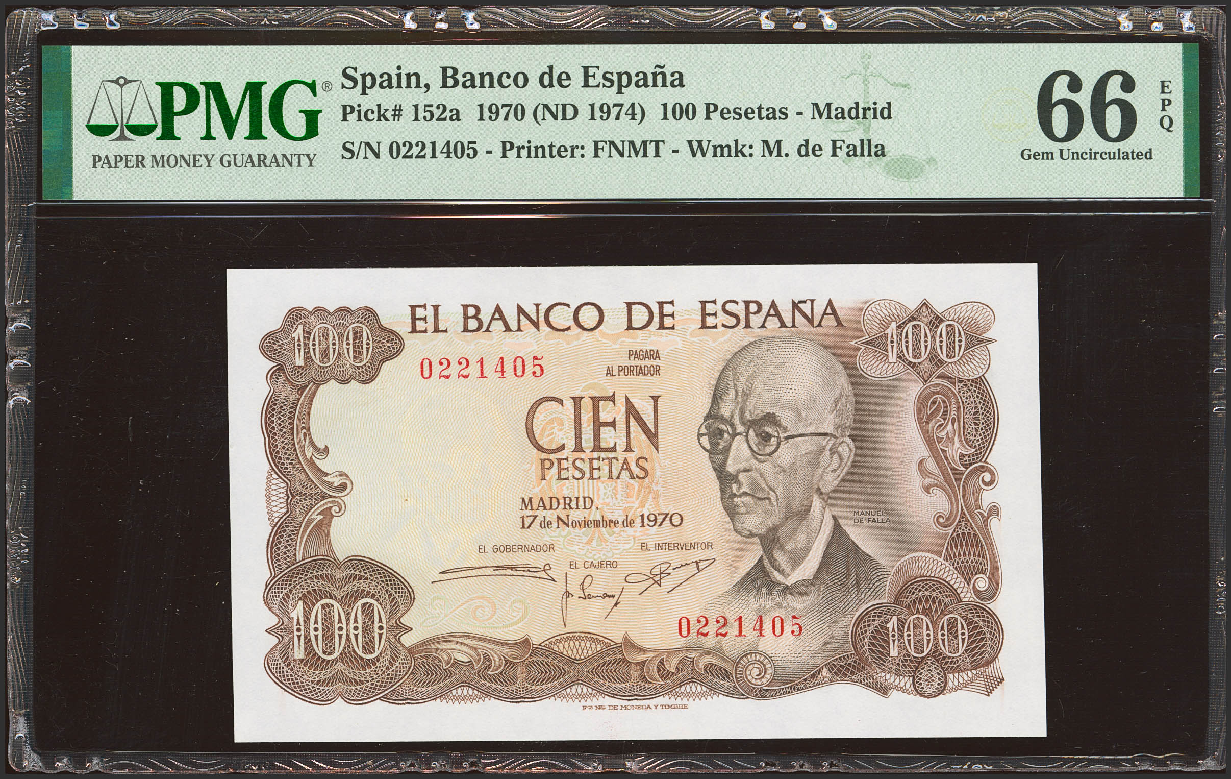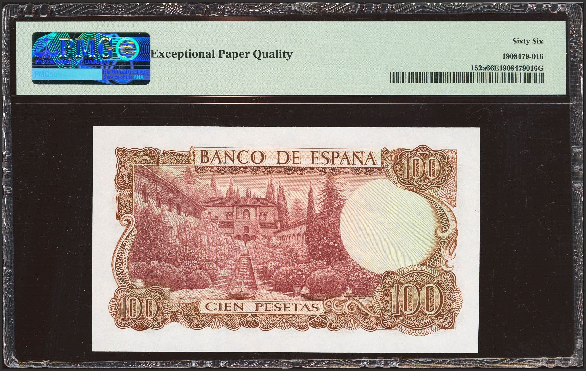 100 Pesetas. 17 de Noviembre de 1970. Sin serie. (Edifil 2023: 472, Pick: 152a). Apresto original. SC. Encapsulado PMG66EPQ.