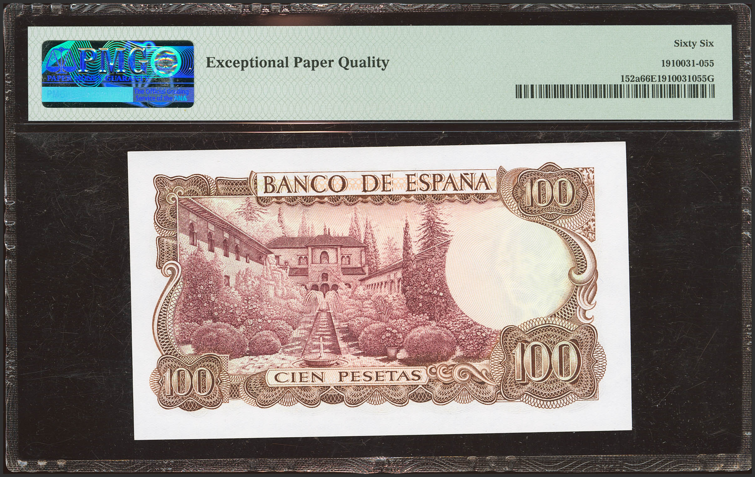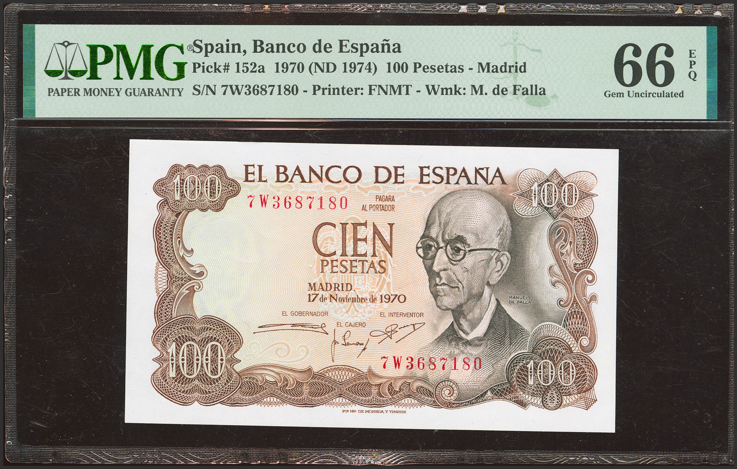 100 Pesetas. 17 de Noviembre de 1970. Serie 7W, última serie emitida. (Edifil 2023: 472c, Pick: 152a). Apresto original. SC. Encapsulado PMG66EPQ.