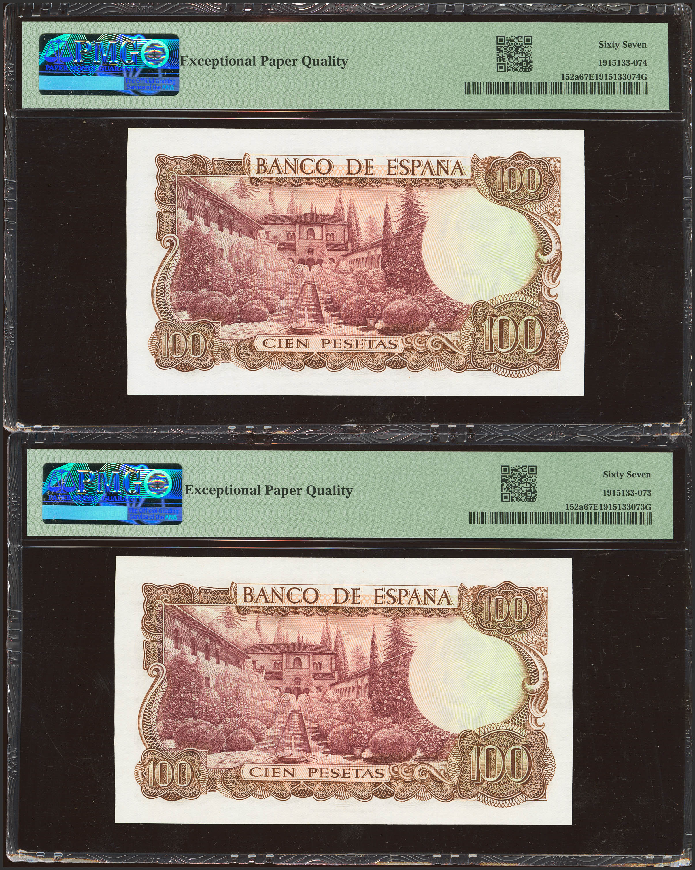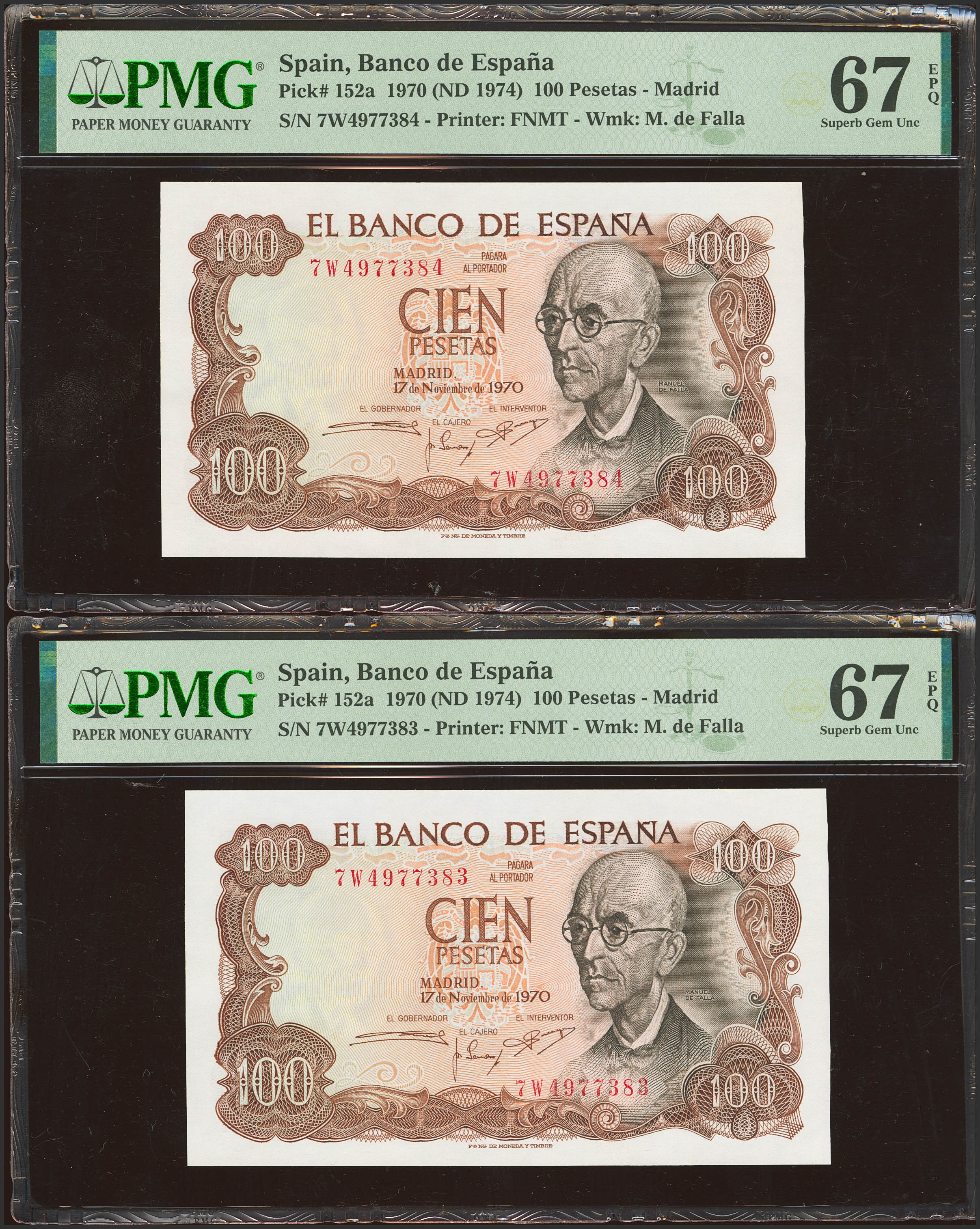 100 Pesetas. 17 de Noviembre de 1970. Pareja correlativa. Serie 7W, última serie emitida. (Edifil 2023: 472c, Pick: 152a). Apresto original. SC. Encapsulados PMG67EPQ, ambos.