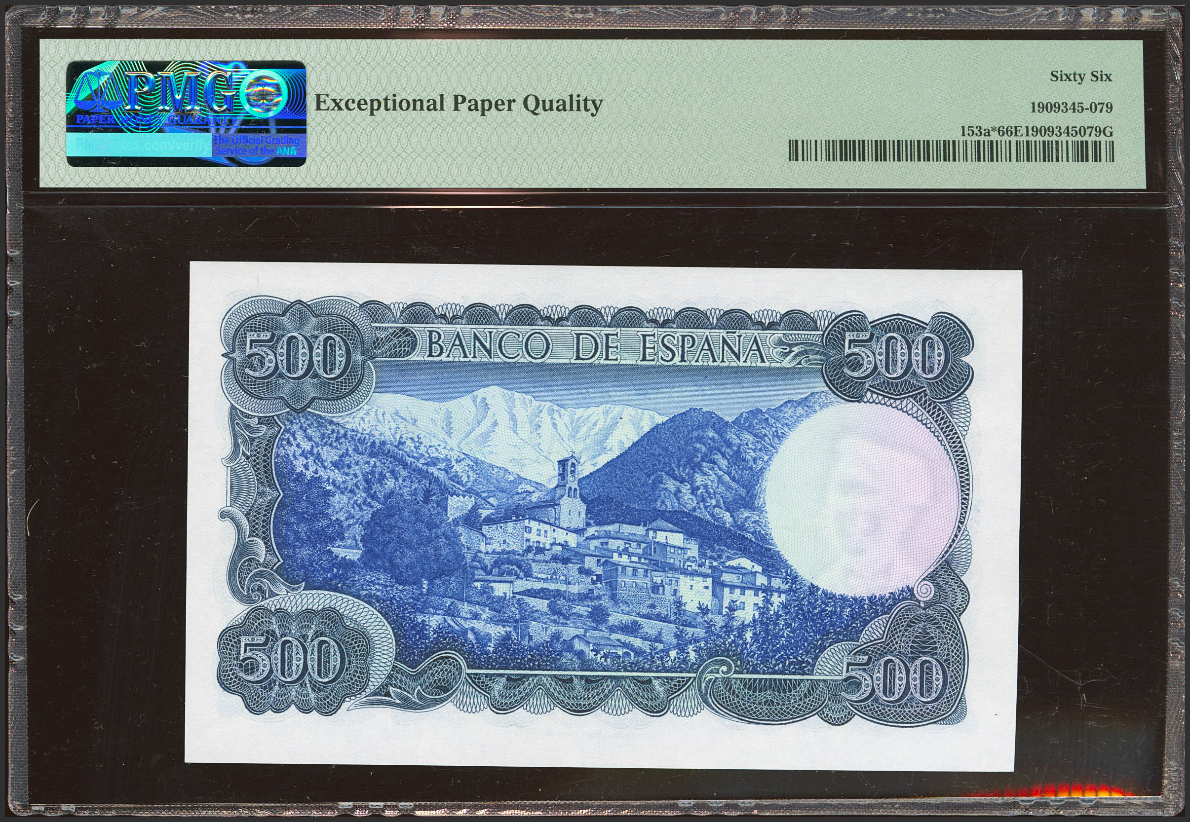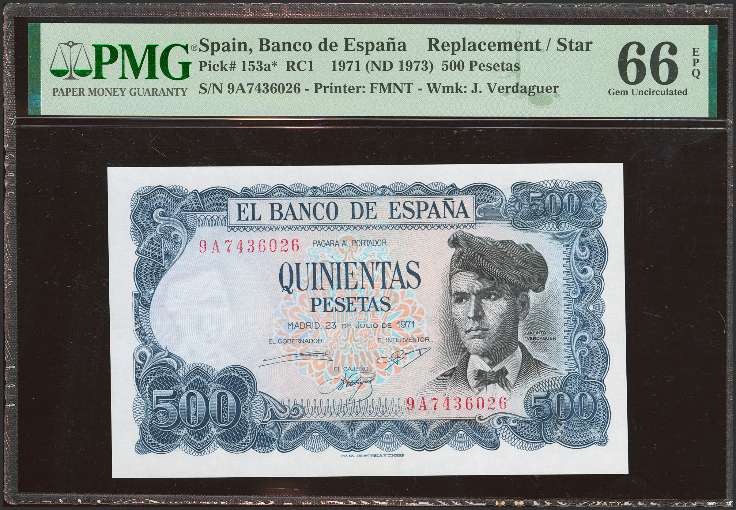 500 Pesetas. 23 de Julio de 1971. Serie especial 9A. (Edifil 2023: 473b, Pick: 153a*). Inusual en esta conservación, apresto original. Encapsulado PMG66EPQ.